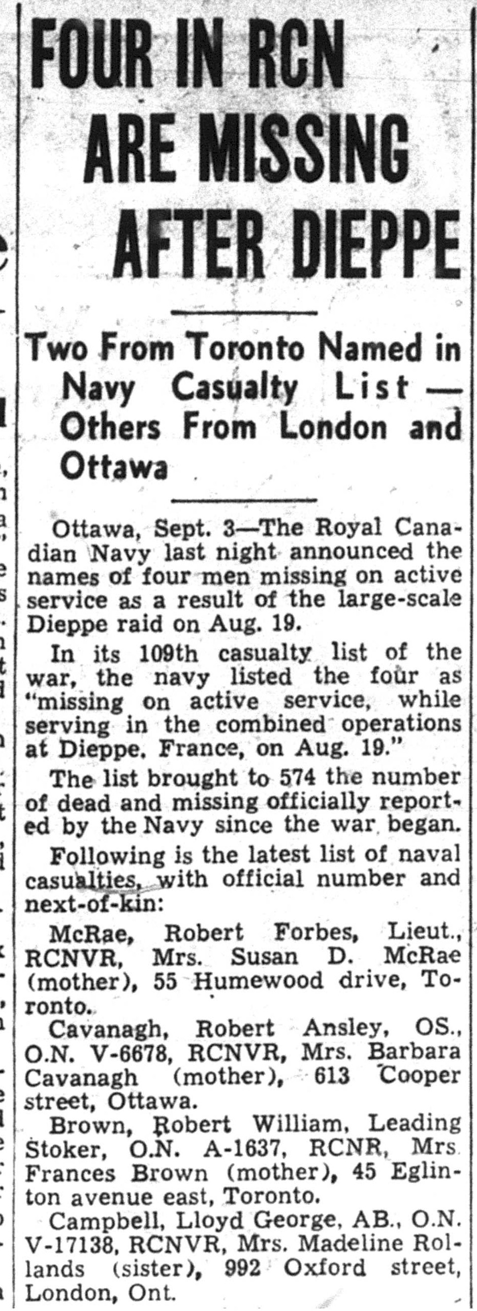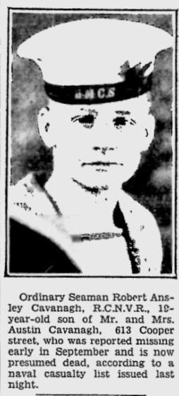 CAVANAGH, Robert Ansley, Able Seaman, Combined Operations, V6678, RCNVR, killed - 19 Aug 1942, HMS QUEBEC - Son of George Austin Cavanagh and Barbara R. Cavanagh, of Ottawa, Ontario.