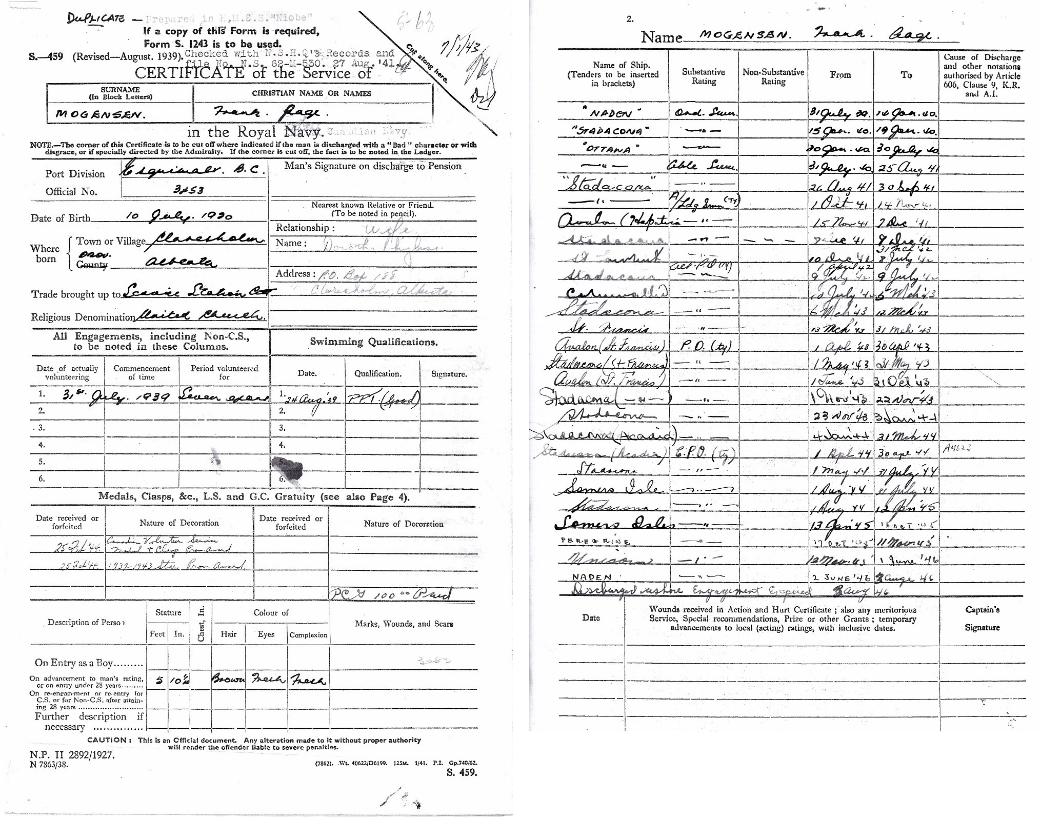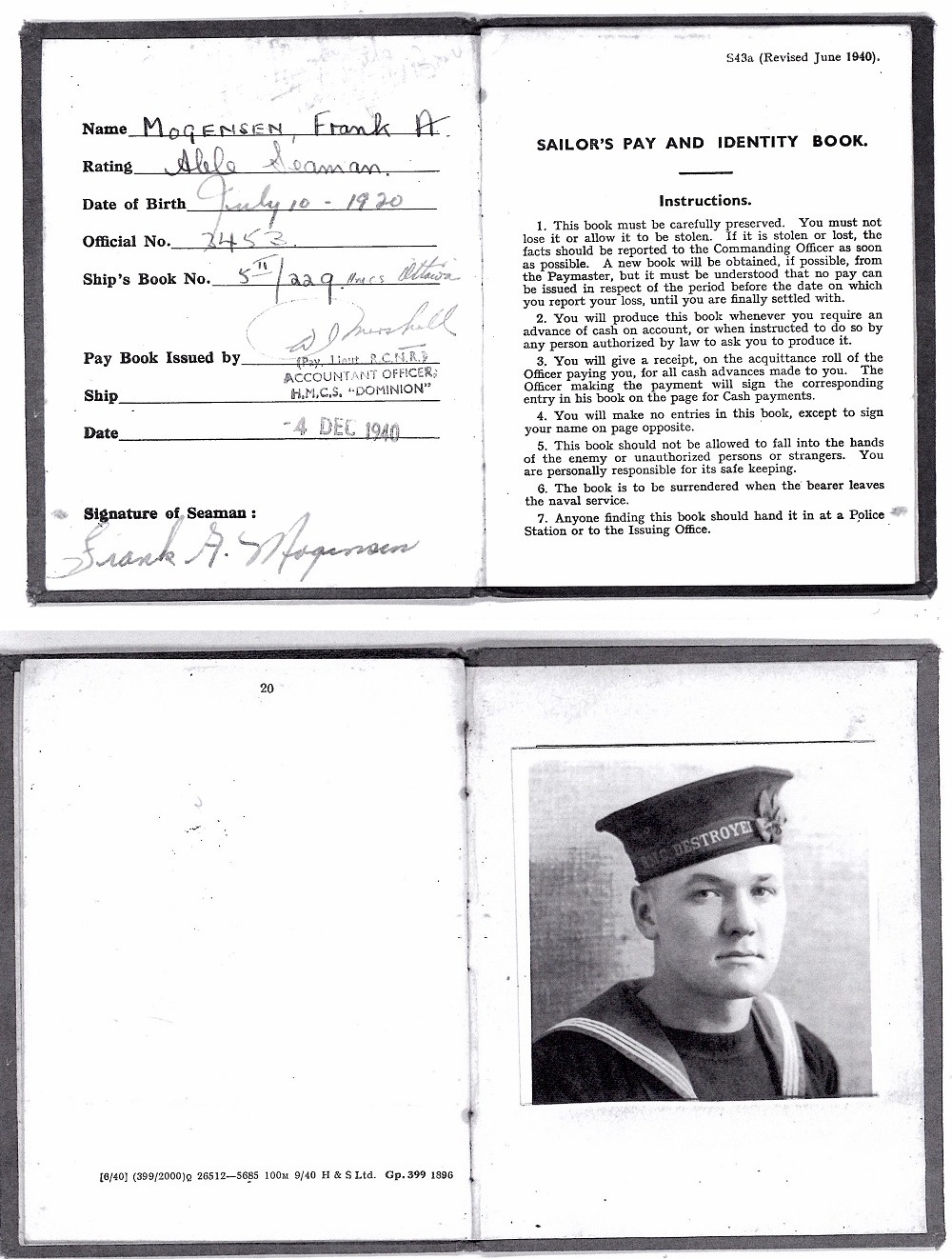 MOGENSEN, Frank - Born July 10, 1920. Frank served in HMCS Ottawa H60 (and other ships) during World War II. He joined the RCN before the start of WWII on July 31, 1939 and was honourably discharged on August 3, 1946. Frank passed away in 1982 at age 63, leaving behind his wife Dorothy, a son, Arvil Mogensen, and daughter Mona Fay Anderson. After the war, he worked for Imperial Oil in Kamloops, BC until 1953 and subsequently moved back to Claresholm, Alberta and was a co-owner of an automobile service company. The family then returned to Kamloops BC in 1956 and shortly thereafter he went to work for Inland Natural Gas Co. - a pipeline and natural gas distribution company serving the interior communities of BC. The family lived in Williams Lake, Merritt, Vernon, Nelson, thereafter Penticton where he eventually retired before his death. Frank was active in the Royal Canadian Sea Cadet Corps. In Vernon, B.C. and was appointed as a Sub-Lieutenant (CIC) in January 1962.