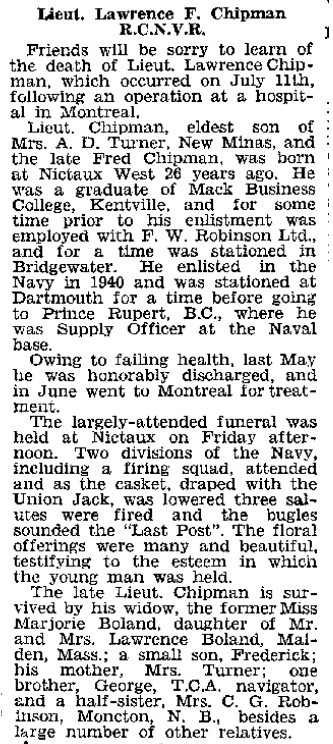 CHIPMAN, Lawrence Fairn, Lt (S), RCNVR, died: 11 Jul 1945, HMCS STADACONA - Son of Mr. and Mrs. Frederick Chipman, of Kentville; husband of Marjorie B. Chipman, of Malden, Massachusetts, U.S.A.