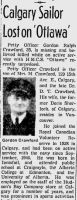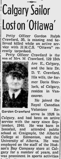 CRAWFORD, Gordon Ralph, PO LTO, V14333, RCNVR, MPK - 13 Sep 1942, HMCS OTTAWA - Son of Daniel T. Crawford, and Jean Crawford (remarried Montgomery) of Calgary, Alberta; husband of Doris Margaret Belle (nee Sherlock) Crawford and step father of Shirley Grace, of Vancouver, British Columbia. Brother of Frances, Frank, Kenneth and Wilfred.