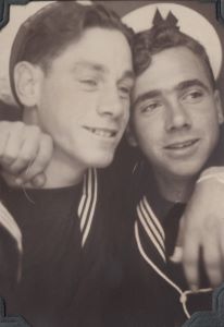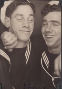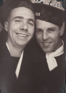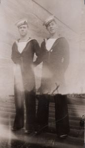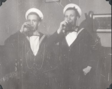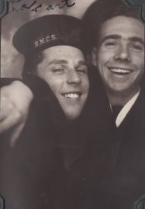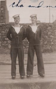(CE01) Charlie Evans (left) and Dick Manderson wearing RCNVR DIVISION SAINT JOHN cap tallies. Photo taken outside HMCS STADACONA, Halifax, NS (CE02) Art Holmes and Charlie Evans (right) (CE03) Charlie Evans (left) and Dick Manderson (CE04) Charlie Evans (left) and Art Holmes