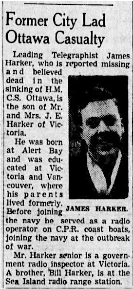 HARKER, James Sharp, L/Tel, V30011, RCNVR, MPK - 13 Sep 1942, HMCS OTTAWA - Son of James Ernest and Ann Hodge Harker, of Victoria, British Columbia.