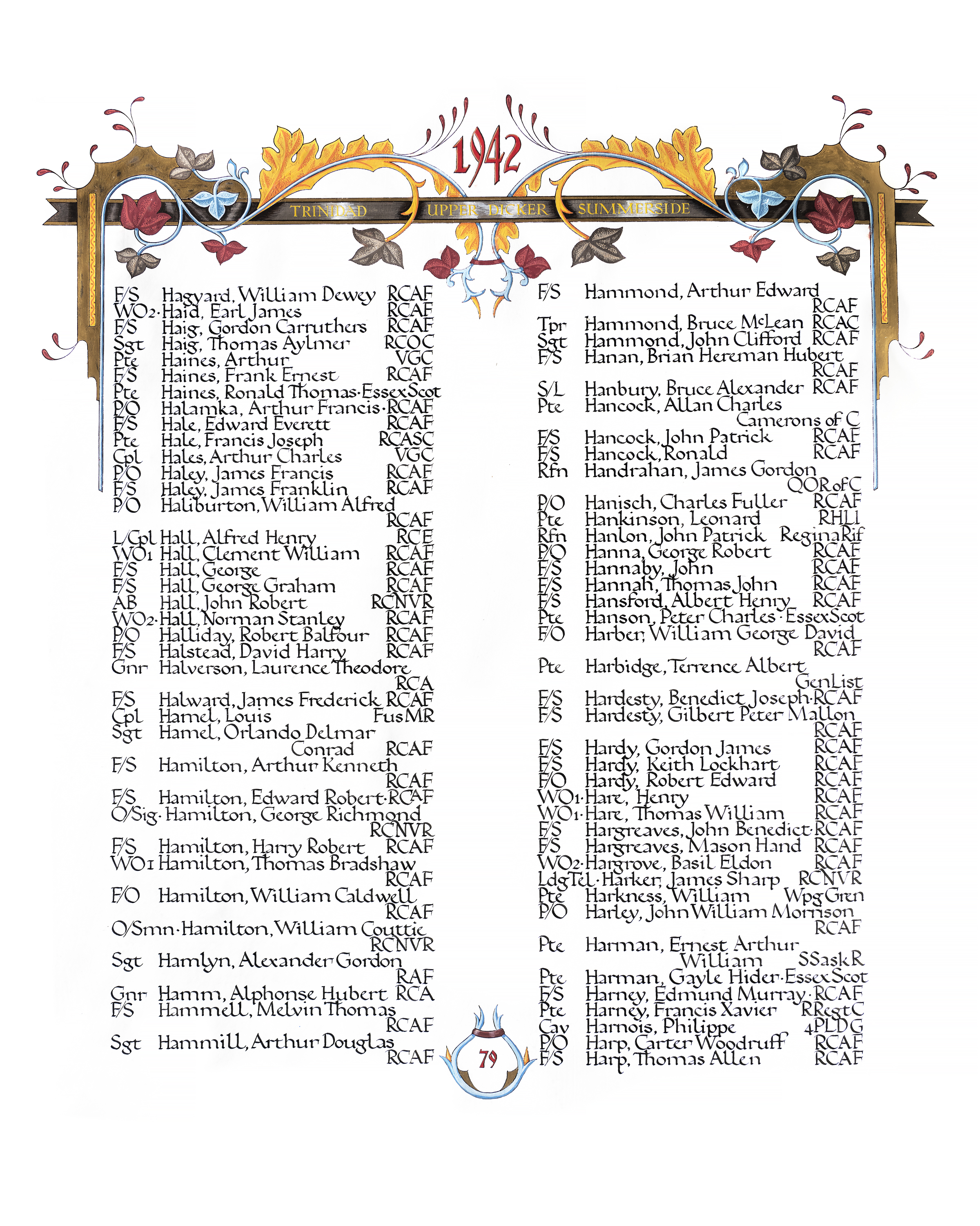 Ships served in: HMCS NADEN - Enlisted 15 Sep 1939. Commenced Active Service 15 Sep 1939 as an Acting Telegraphist RCNVR HMCS RESTIGOUCHE - Drafted to RESTIGOUCHE 15 Nov 1939 HMCS STADACONA - Drafted to STADACONA 09 Dec 1939 HMCS ARLEUX - Drafted to ARLEUX 14 Feb 1940 HMCS VENTURE (Staff) - Drafted to VENTURE 16 May 1940 HMCS STADACONA - Drafted to STADACONA 17 May 1940 HMCS REINDEER - Drafted to REINDEER 01 Aug 1940 HMCS ELK - Drafted to ELK 06 Dec 1940 * Rated Acting Leading Telegraphist, RCNVR 20 Jan 1941 HMC SIGNAL SCHOOL - Drafted to HMC SIGNAL SCHOOL 10 Jul 1941 HMCS OTTAWA - Drafted to OTTAWA 26 Aug 1941 * Rated Leading Telegraphist, RCNVR 20 Jan 1942