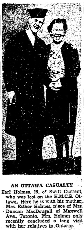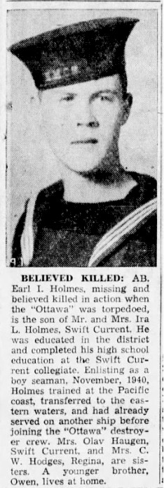 HOLMES, Earl Ira, AB, 4066, RCN, MPK - 13 Sep 1942, HMCS OTTAWA - Son of Ira Layton Holmes and Esther Lorinda Holmes, of Swift Current, Saskatchewan.