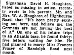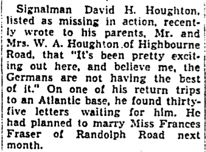 Ordinary Signalman David Harvey Houghton enlisted in the R.C.N. in June, 1940. He trained at St. Hyacinthe and Toronto, and HMCS Ottawa was his first ship. He was born in Toronto and attended Danforth Park School and East York collegiate. He was a salesman at the time of his enlistment. His wedding to Miss Frances Fraser, Randolph Road, Leaside, was planned for next month. Signalman Houghton son of Mr. and Mrs. W. A. Houghton, Highbourne Road and has three sisters, Eva, Violet and Margaret, and one brother, Wilfred, all of Toronto. Ordinary Signalman Houghton wrote home stating, "It's been pretty exciting out here and believe me, the Germans are not having the best of it", who told of Atlantic action in a letter home.