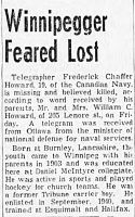 HOWARD, Frederick Chaffer, Tel, 3774, RCN, MPK - 13 Sep 1942, HMCS OTTAWA - Son of William Chaffer Howard and Gertrude Maud Howard, of Winnipeg, Manitoba.