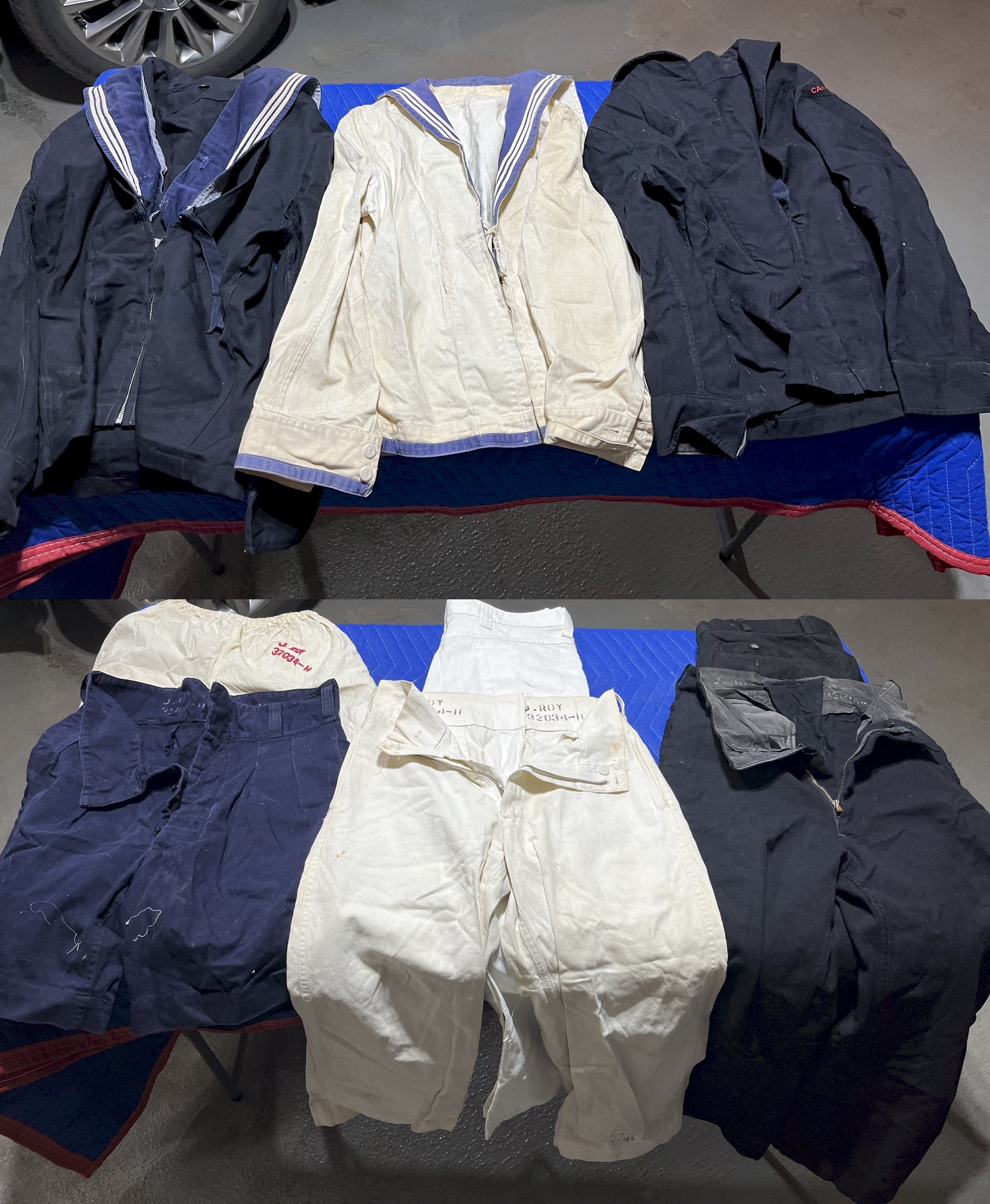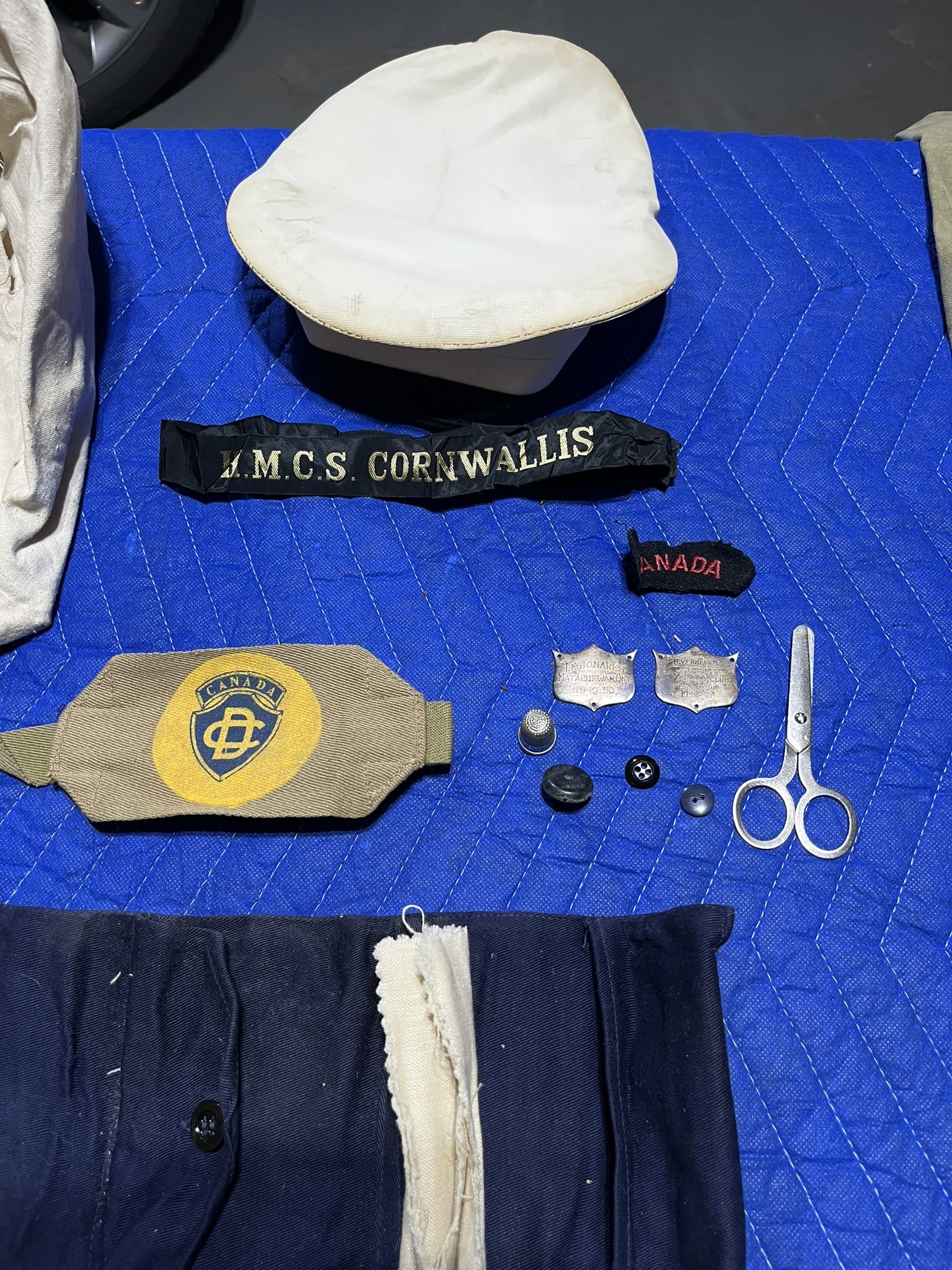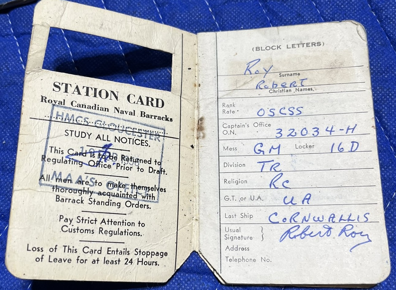 (JRR003) Robert's Station Card for HMCS GLOUCESTER (JRR004) Part of Robert's Kit - cap, cap tally, sewing kit (bottom) aka housewife (JRR005) Part of Robert's kit - jumpers and pants/shorts (JRR006) Part of Robert's Kit - Naval Burberry