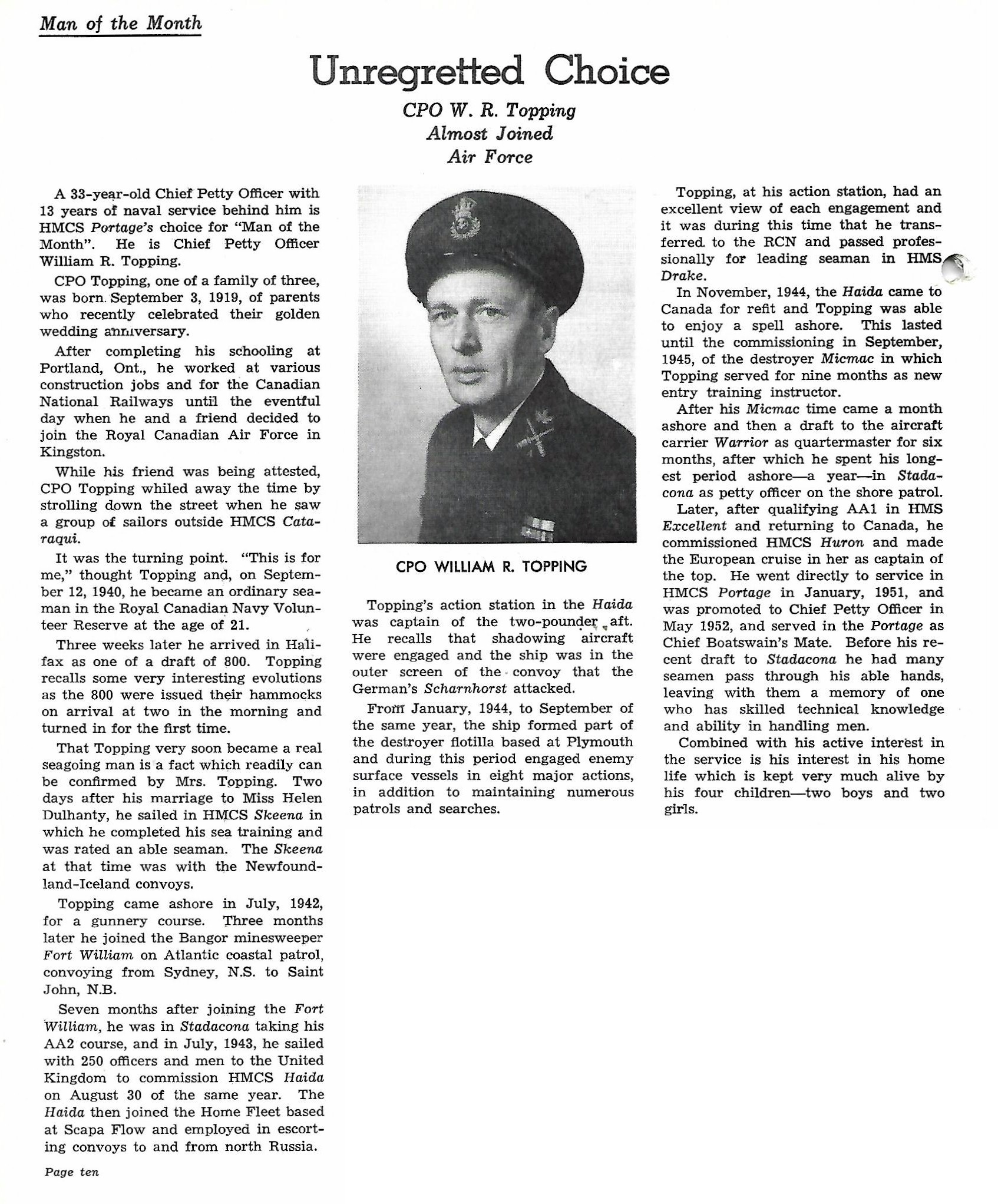Ships served in: KINGSTON DIVISION RCNVR - Enlisted 12 Sep 1940 HMCS HAIDA - Commissioning crew HMCS DRAKE HMCS MICMAC - Commissioning crew HMCS EXCELLENT HMCS HURON - Commissioning crew (2nd Commissioning) * Rated Chief Petty Officer, RCN May 1952