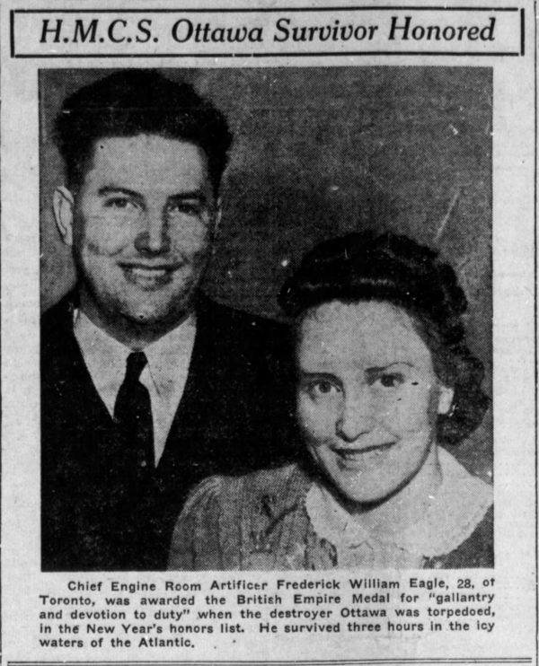 EAGLE, Frederick William, Chief Engine Room Artificer, 21549, British Empire Medal (BEM), RCN - Awarded as per Canada Gazette of 9 January 1943 and London Gazette of 1 January 1943.