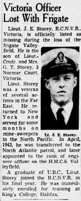 Lieutenant Storey died when his ship, HMCS VALLEYFIELD, was torpedoed and sunk on 07 May 1944 by U-548. Of her crew of 163, there were only 38 survivors.