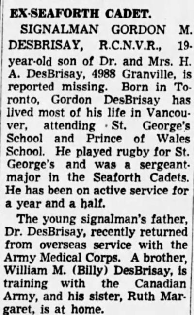 DES BRISAY, Gordon Montgomery, Sig, V39948, RCNVR, MPK - 20 Sep 1943, HMCS ST CROIX