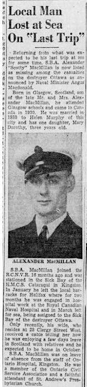 MacMILLAN, Alexander L/SBA, V18315, RCNVR MPK - 13 Sep 1942, HMCS OTTAWA - Son of Alexander and Ellen MacMillan; husband of Mary Helen MacMillan, of Kingston, Ontario.