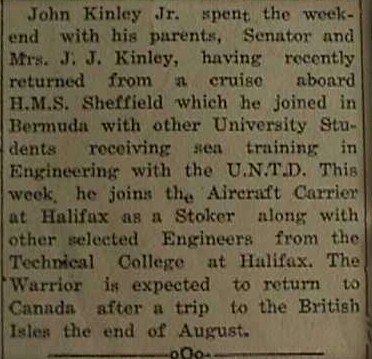 Article from the Lunenburg Progress Enterprise, Wed, 03 Sep 1947 Pg Four - Local and General - John Kinley Jr. returned Saturday from three months training in the U.N.T.D. of R.C.N., his last month being on the Aircraft Carrier "Warrior" on a trip to Scotland. (Researched by George Newbury)