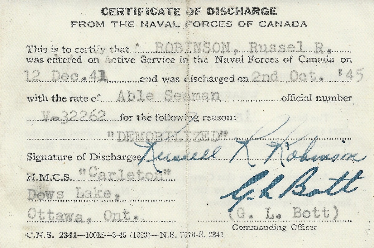 Ships served in: HMCS CARLETON - Commenced Active Service 12 Dec 1941 HMCS CARLETON - Demobilized 02 Oct 1945