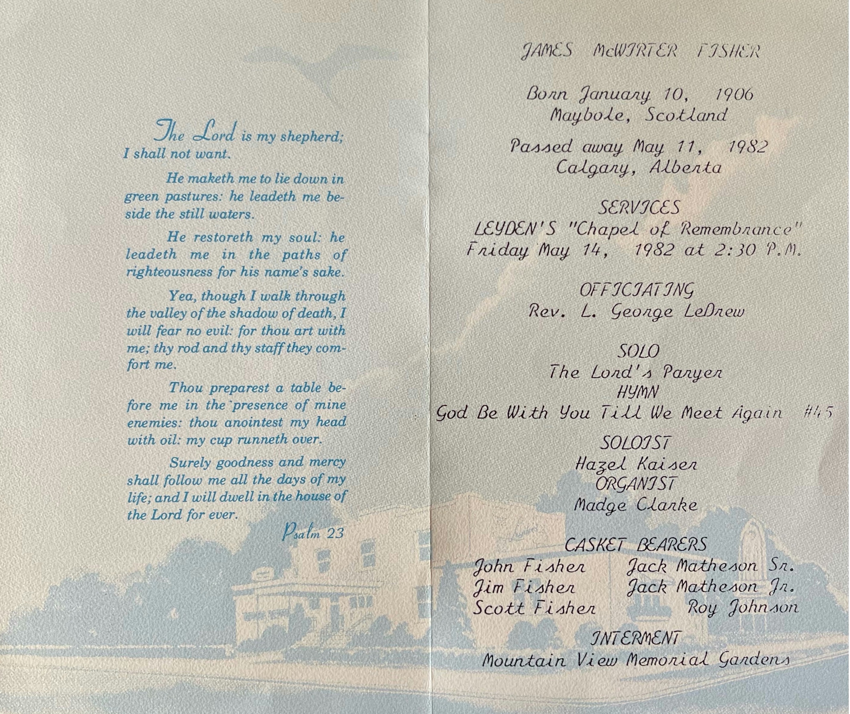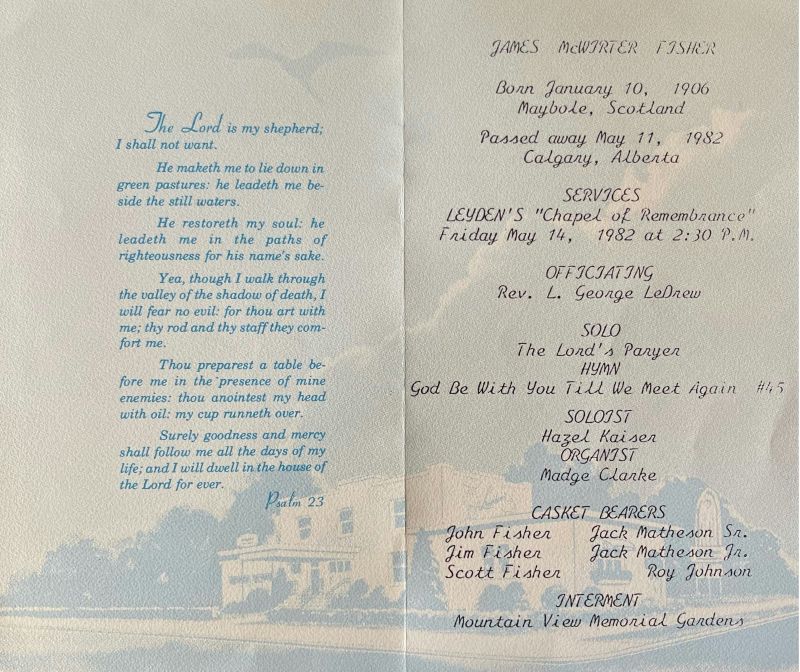 FISHER, James McWirter - May 11, 1982, James M. Fisher, aged 76 years, beloved husband of Mrs. Mary Fisher, 226 - 91 Street, N.E., dear father and father-in-law of Margaret and Jack Matheson; James Fisher and John and Charlotte Fisher, all of Calgary, and Sharon and Don Childs, London, Ontario. He is also survived by nine grandchildren; two sisters, Jessie Munro, Medicine Hat and Jean Fast, Victoria, B.C., and a brother, David; and several nieces and nephews. He was predeceased by three brothers and a sister. Born at Maybole, Scotland he came to Canada in 1912 to Calgary and received his education at Calgary and resided at Calgary since. He was a veteran of World War II, having served overseas with the Royal Canadian Navy. Mr. Fisher was employed with the City of Calgary, Sanitation Department for over twenty-five years and as in inspector for a number of years until his retirement. He was a member of the Royal Canadian Legion (Albert No 1 Branch), Calgary. Services at Leyden's Chapel of Remembrance (1719 - 2 St. S.W.), Friday, 2:30 p.m. with Rev. L. George Ledrew officiating. Interment, Mountain View memorial Gardens.