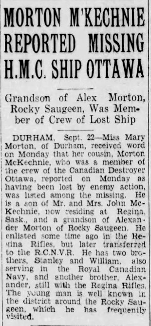 McKECHNIE, Morton Hugh, AB, V10554, RCNVR, MPK - 13 Sep 1942, HMCS OTTAWA - Son of John and Frances Marion McKechnie, of Regina, Saskatchewan.