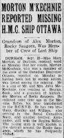 (MM01) Article on Morton McKechnie report missing // The Regina Leader Post Sep 1942 (MM02) Article on Morton McKechnie reported missing // The Owen Sound Sun Times Sep 1942 (MM03) Service File for Morton McKechnie // Source: Library and Archives of Canada