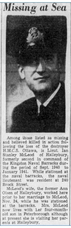 Lieut. Ian S. McLeod, the son of Mrs. Lillian McLeod, 811 King Street, East, was navigation officer aboard the Ottawa. A graduate of Central Collegiate here, he had been in the RCNVR over two years. He was 27 years old last Saturday. Formerly attached to a corvette, Lieut. McLeod had been aboard the Ottawa since May 01. He had taken special courses in Canada and Great Britain before being assigned to service aboard the Ottawa. His wife, the former Ann Olson, of Haileybury, Ontario, they were married in Peterborough in November, 1940, and his one son, Ian Douglas, resides with his parents at the King Street address. Lieut. McLeod was employed by the Imperial Tobacco Company at the time of his enlistment. He joined the navy in September, 1940. He trained at Kingston and Halifax and was second in Command of the corvette HMCS Barrie before he was promoted to navigation officer of HMCS Ottawa. His mother lives in Hamilton.