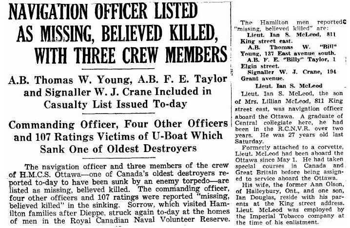 (ISM01) Article Lt Ian McLeod reported Missing // The Kingston Whig Standard (ISM02) 4 crew members of HMCS OTTAWA reported missing // The Hamilton Spectator 21 Sep 1942 (ISM03) Service file for Ian McLeod // Source: The Library and Archives of Canada