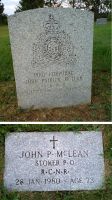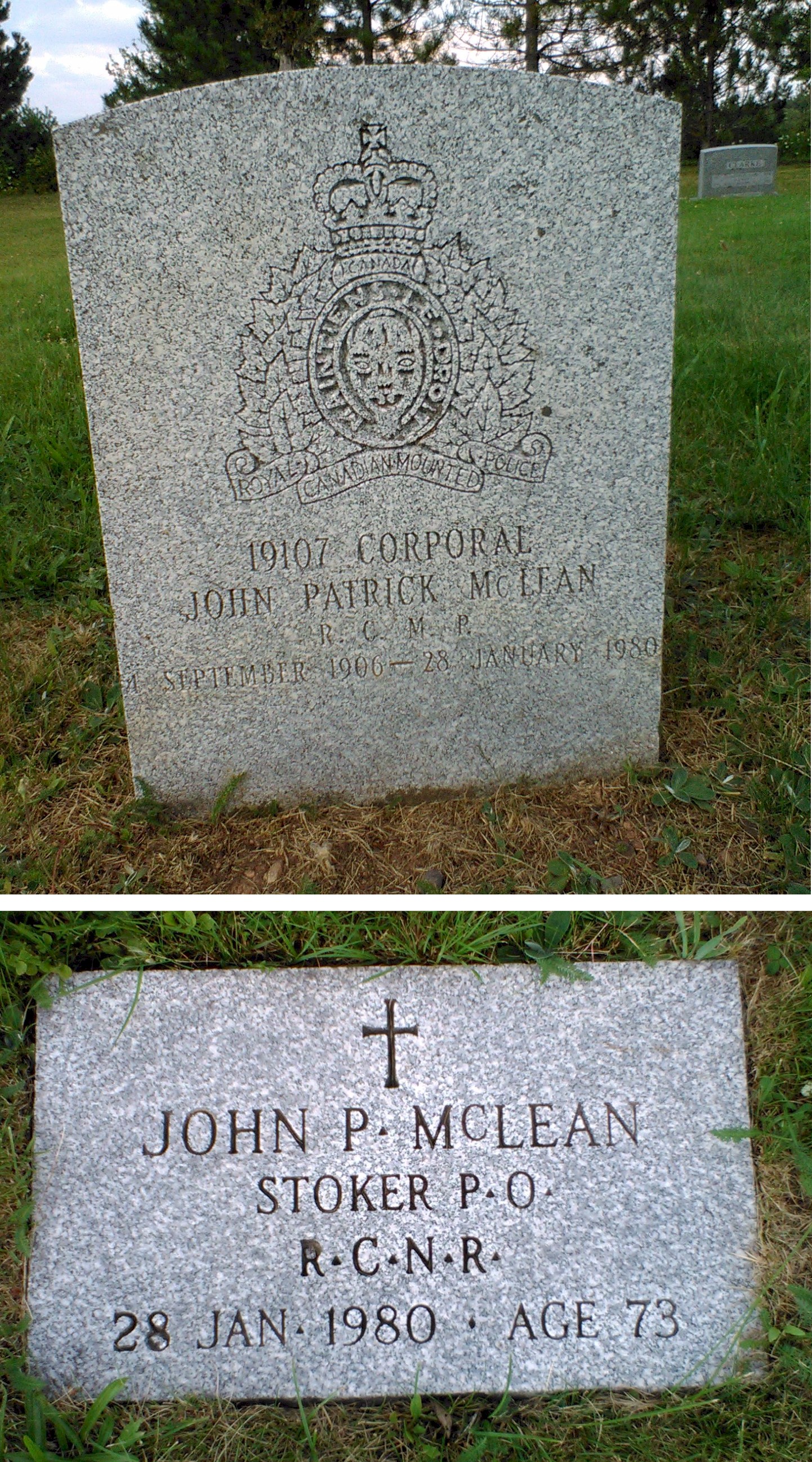 (JPM01) PO John McLean and his daughter (JPM02) PO John Mclean with his wife and daughter (JPM03) John McLean on an unknown ship. Note that he is wearing an RCMP cap - so likely a member of the RCMP marine division (JPM04) RCMP headstone and Veteran's headstone for John McLean // Source: Find-a-Grave Service information on photos courtesy of Curtis Mainville