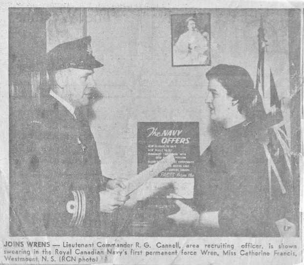 Article on Catherine Francis swearing in as the 1st post-wartime Wren in the RCN