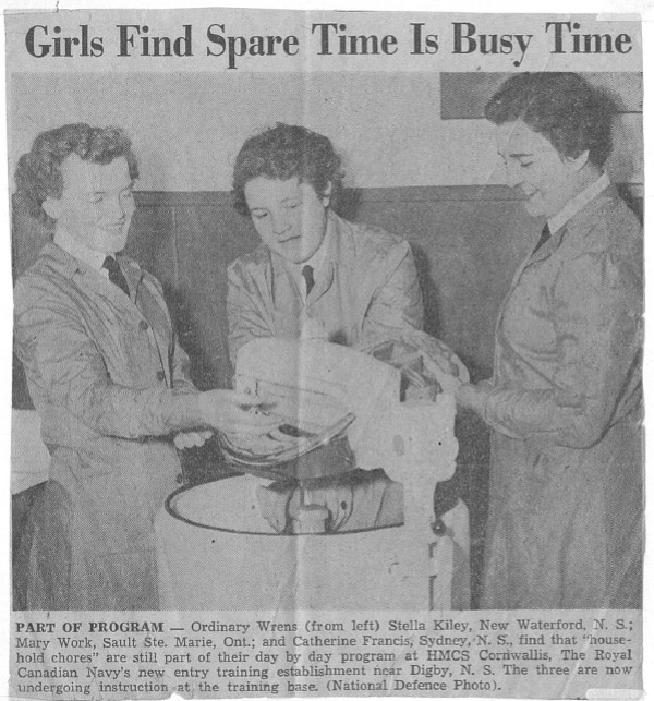 Ordinary Wrens (L-R) Stella Kiley of New Waterford, NS; Mary Work of Sault Ste Marie, ON; and Cartherine Francis of Sydney, NS doing laundry at HMCS CORNWALLIS