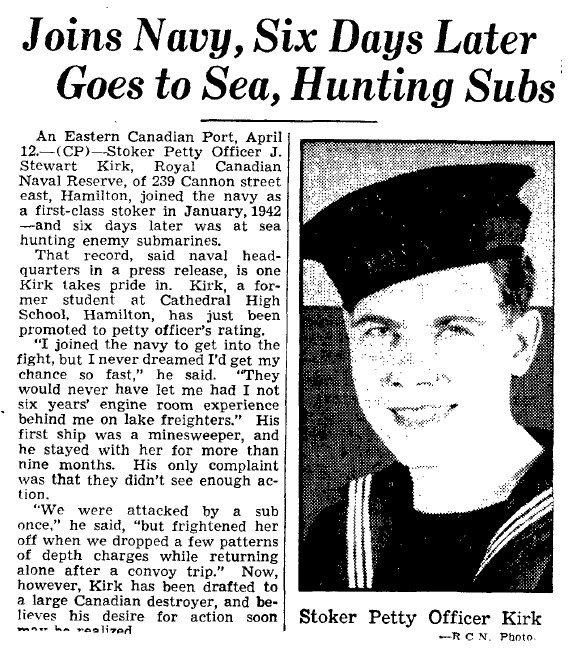 Article on Stoker Petty Officer J. Stewart Kirk, RCNR