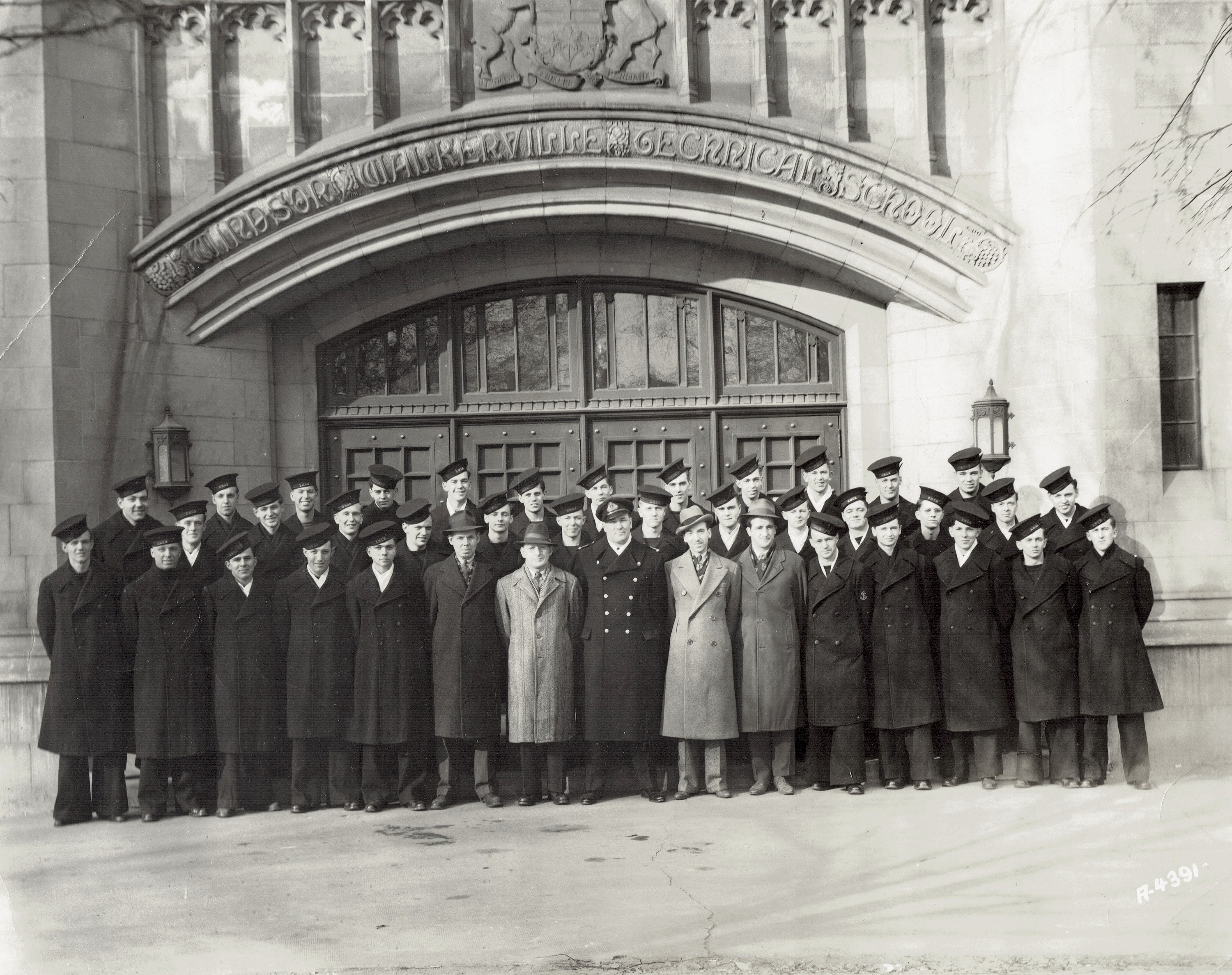 (CWC001) Portrait of PO Charles Callow (CWC002) Charles Callow's medals (CWC003) Naval College course photo in front of the Windsor Walkerville Electrical School - Charles Callow, front row, 4th from left (CWC004) Some of Charles' HMCS NEW WATERFORD memorabilia