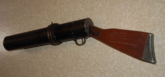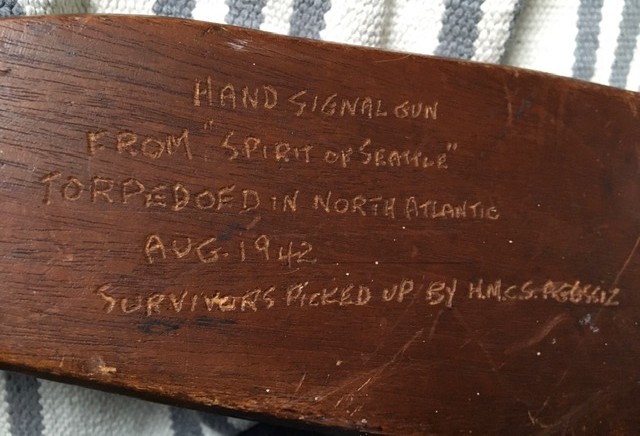(HS01-HS02) US Navy Signal Gun from the S.S. Spirit of Seattle whose crew was rescued by HMCS AGASSIZ after the ship was torpedoed in Aug 1942 (HS03) Harry Smith's morse key (HS04) Letter open - the handle was made with the casing from a .50 cal shell