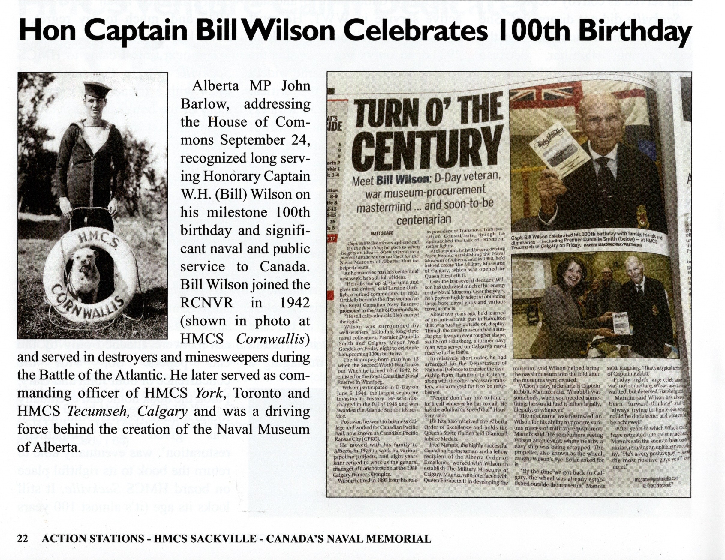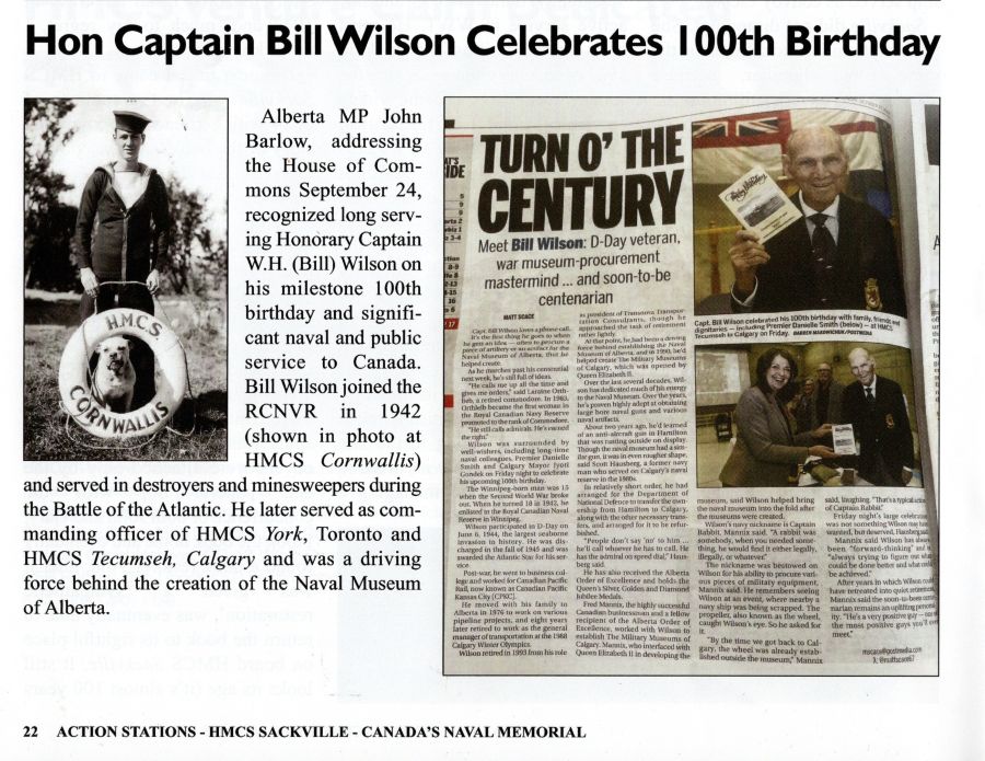 Known during the war as Tug and later as Captain Bill, Wilson was discharged from active service in the fall of 1945; however, he joined the naval reserve that same year and rose through the ranks over the ensuing years. He retired from active service in 1979, having reached the rank of Captain in the Royal Canadian Navy. He now lives in High River, Alberta and at 100, his house still remains free of tomato ketchup.