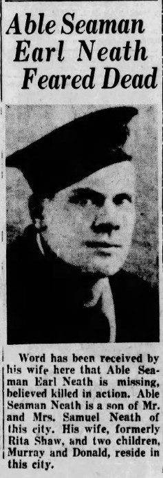 NEATH, John Frederick Earl, AB A/ST, V22970, RCNVR, MPK - 13 Sep 1942, HMCS OTTAWA - Son of William and Frances Neath, of Owen Sound, Ontario; husband of Rita D. Neath, of Owen Sound.