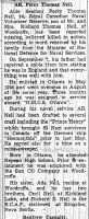 Able Seaman Percy Thomas Neil, 24, son of Mr. and Mrs. Richard Thomas Neil, of Woodroffe, has been reported missing, believed killed in action, according to word received by his family from the Minister of National Defence for Naval Services. On September 7, his father had received a cable from him stating he was in England and that everything was well with him. He enlisted in Ottawa in May 1940 and went overseas in August of the same year. Three months ago he was assigned to service aboard HMCS Ottawa. During his naval service AB Neil had been drafted to several craft including the Prince Henry which brought 53 Nazi survivors to Canada off the German ship "Hermonthis prior to last May. He served also for a time on a minesweeper. Born in Ottawa, he attended Nepean High School. Prior to enlistment he was employed with the Sun Oil Company at Woodroffe. His sister, Ada Neil, resides at Woodroffe, and he has two brothers, Cecil Neil, at Kirkland Lake and Richard e. Neil in the RCAF, stationed at Kingston, Nova Scotia.