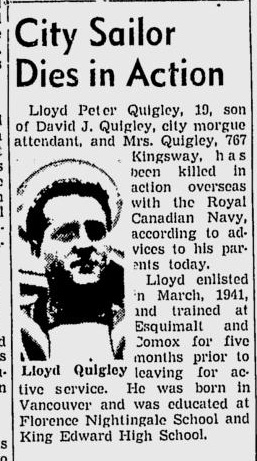QUIGLEY, Lloyd Peter William, AB, 4253, RCN, MPK - 13 Sep 1942, HMCS OTTAWA - Son of David J. and Sadie Quigley, of Vancouver, British Columbia.