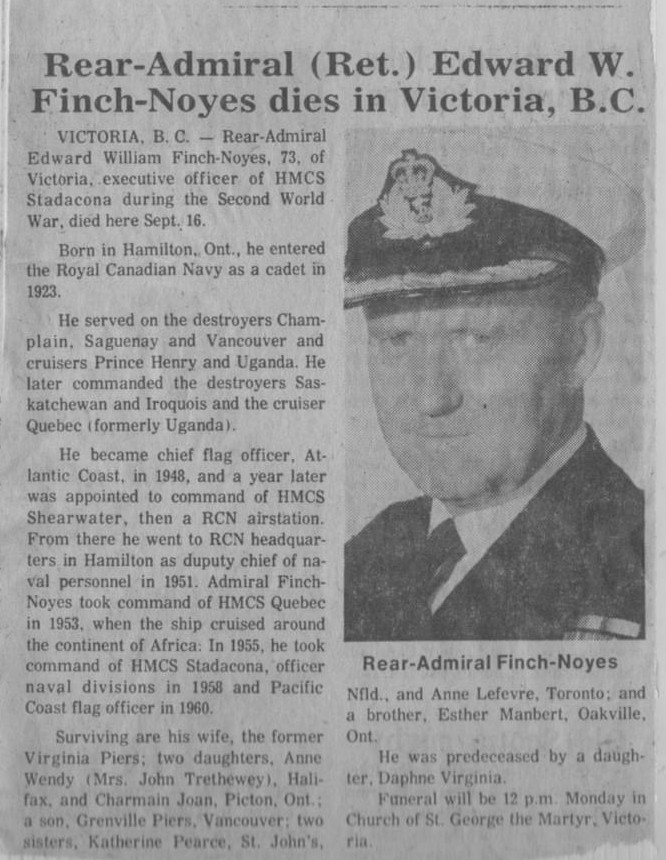 Ships served in: HMS EMPEROR OF INDIA (1927) HMCS CHAMPLAIN - Appointed to Champlain on 01 Jun 1931 as SLt, RCN HMS IRON DUKE (1934, as Lt, RCN) HMCS VANCOUVER - Served in Vancouver in 1934 as 1st Lt. HMCS PRINCE HENRY - Appointed to Prince Henry 08 May 1942 as Lt, RCN. 4th Commanding Officer HMCS PRINCE ROBERT - 5th Commanding Officer HMCS SASKATCHEWAN - Appointed to Saskatchewan 16 Feb 1944 as LCdr, RCN // 3rd Commanding Officer HMCS IROQUOIS - 4th Commanding Officer HMCS UGANDA - Served in Uganda in 1945 as XO CHIEF OF STAFF TO FLAG OFFICER ATLANTIC COAST - Appointed 05 Oct 1948 HMCS SHEARWATER - Appointed 01 Aug 1949 as Commanding Officer HMCS QUEBEC - 2nd Commanding Officer - Appointed 11 Sep 1953 - 31 Jul 1955 HMCS STADACONA - Appointed 15 Aug 1955 as Officer in Charge RCN Depot, Halifax HMCS PATRIOT - Appointed 31 Mar 1958 as Commanding Officer Naval Divisions and as Senior Officer in Chief Command FLAG OFFICER PACIFIC COAST - Appointed 30 Jun 1960