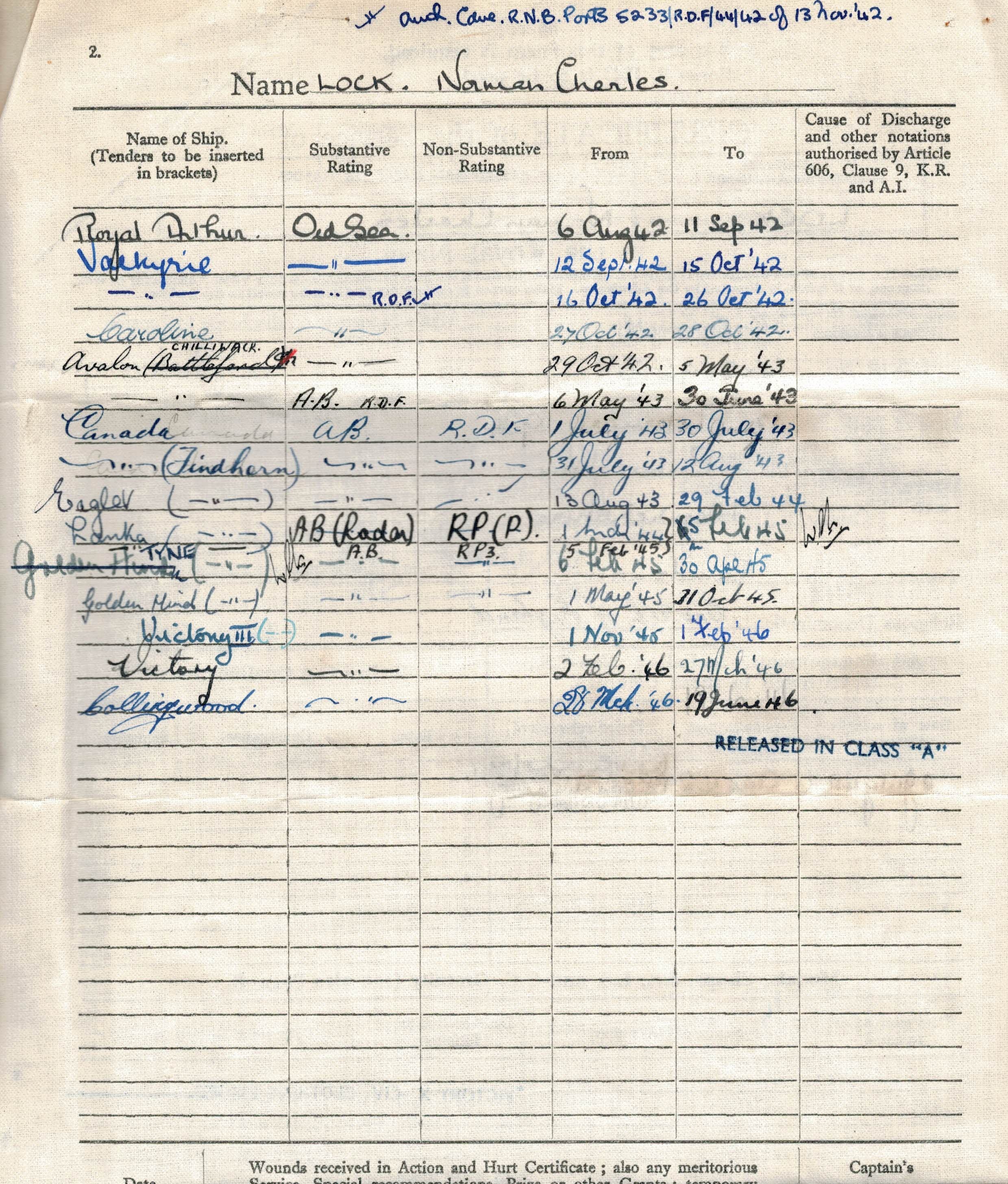 Ships served in: HMS ROYAL ARTHUR - Enlisted 06 Aug 1942 as an Ordinary Seaman, RN. Royal Arthur was a shore base at Skegness for new entries / initial training HMS VALKYRIE - Drafted to VALKYRIE 12 Sep 1942. HMS VALKYRIE was a shore base at Douglas, Isle of Man; radar training establishment * Rated Radio Direction Finder Operator 16 Oct 1942 HMS CAROLINE - Drafted to CAROLINE 27 Oct 1942. CAROLINE was a shore base at Belfast, Northern Ireland HMCS CHILLIWACK - Drafted to CHILLIWACK 29 Oct 1942 * Rated Able Seaman, Radio Direction Finder Operator 01 Jul 1943 HMS CANADA - Drafted to CANADA 01 Jul 1943. CANADA was a Royal Navy shore base at Halifax, NS HMS FINDHORN - Drafted to FINDHORN 31 Jul 1943 * Rated Able Seaman Radar Operator (Probationer) 01 Mar 1944 * Rated Able Seaman Radar Operator 3rd Class 05 Feb 1945 HMS VICTORY III - Drafted to VICTORY III 01 Nov 1945. VICTORY III was a shore base at Portsmouth, England HMS VICTORY - Drafted to VICTORY 02 Feb 1946 HMS COLLINGWOOD - Drafted to COLLINWOOD 28 Mar 1946. COLLINGWOOD was a shore base at Fareham, England * Honourary Released 19 Jun 1946