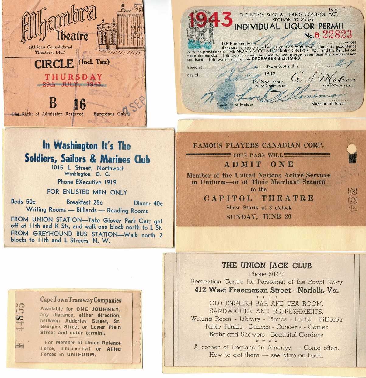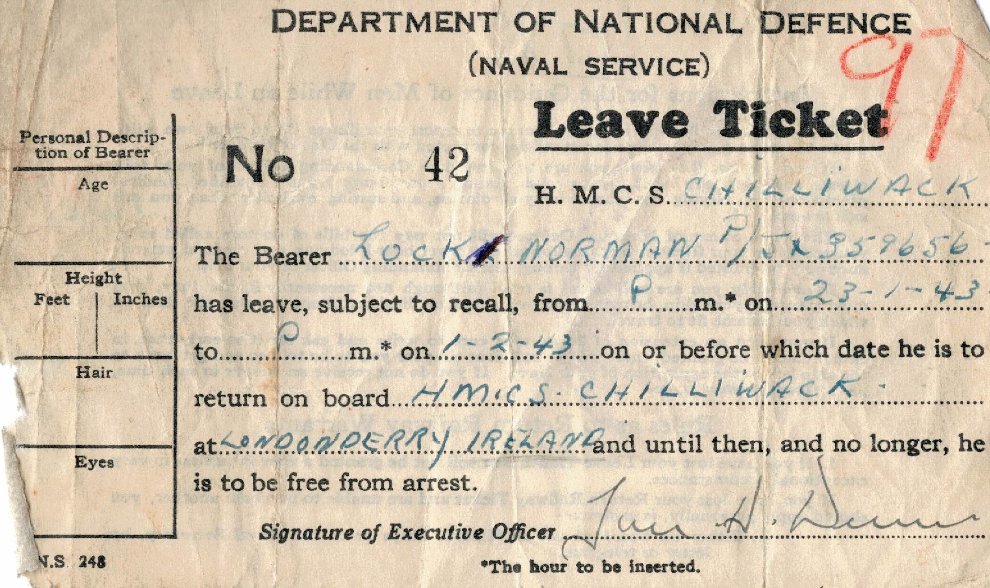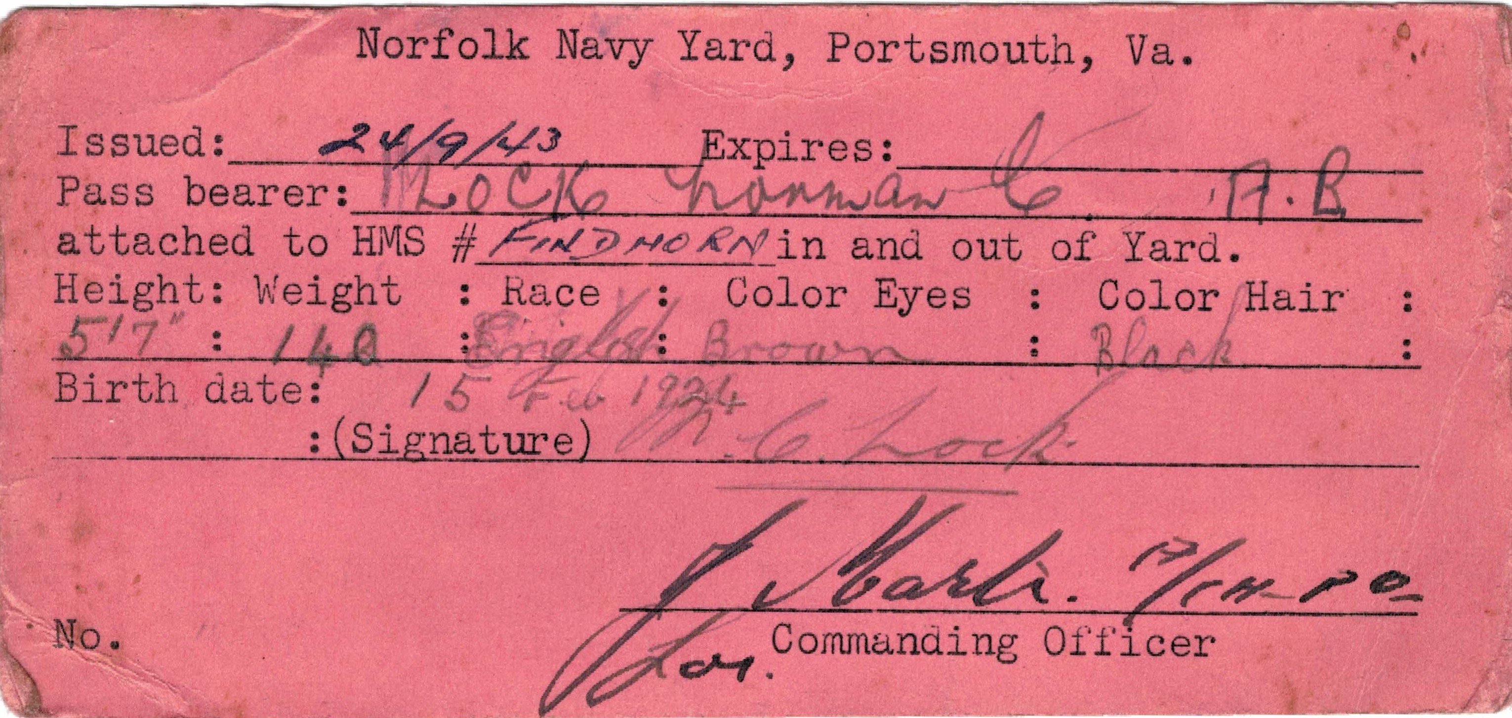 (NCL016) Norman Lock in New York with unknown friend / shipmate (NCL017) Pass to get into the Norfolk Navy Yard, Portsmouth, Virginia (NCL018-NCL019) Unidentified sailors on HMS FINDHORN