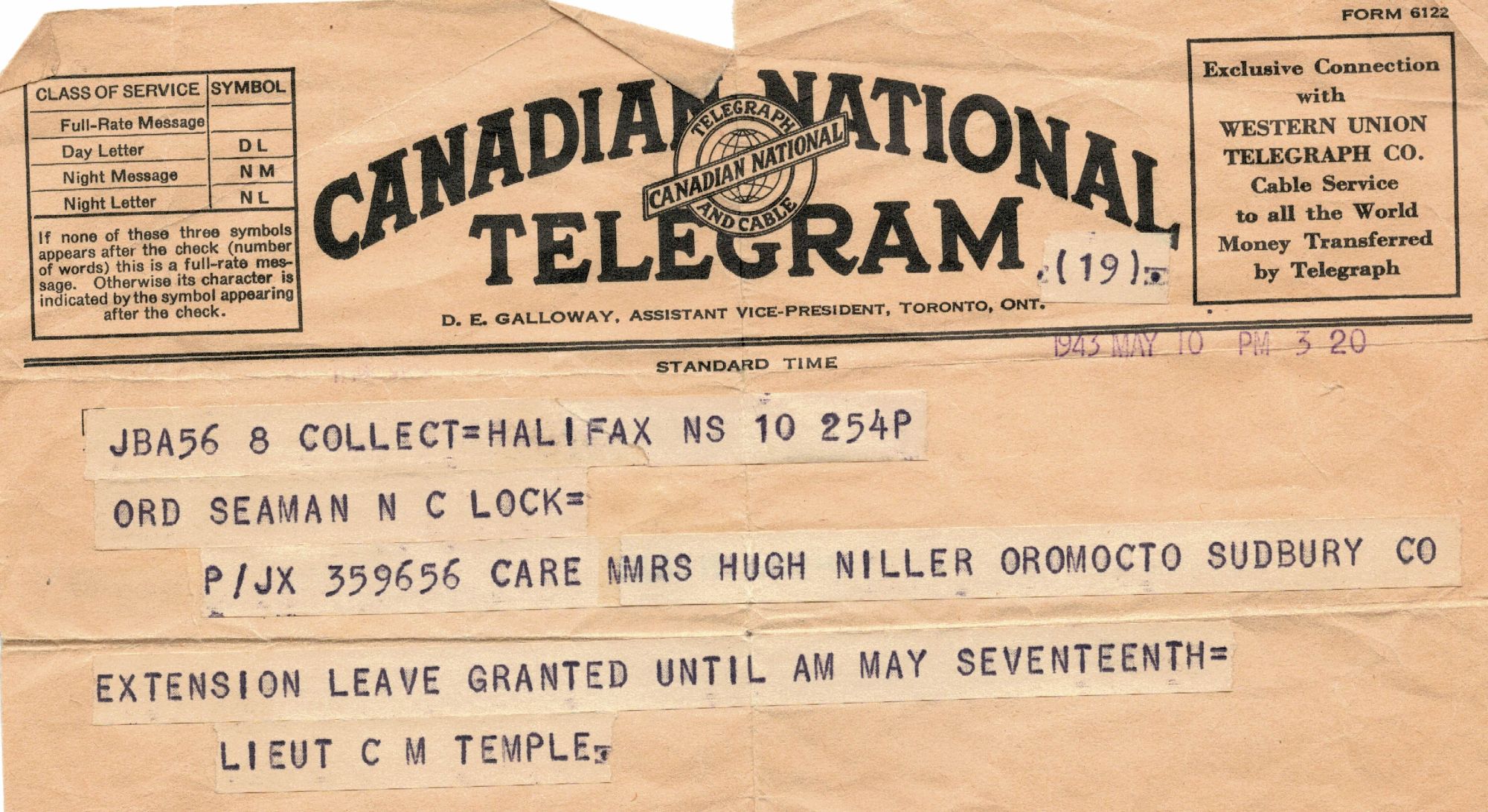 (NCL001) Portrait of Seaman Norman Lock (NCL002) Norman Lock's Medals: 1939-45 Star, Atlantic Star, Burma Star with Pacific bar, Defence Medal, War Medal 1939-45 (NCL003) Certificate of Service, Page 2, for Norman Lock (NCL004) Leave Ticket for Norman Lock 21 Jan 1943 - 01 Feb 1943 while serving in HMCS CHILLIWACK K131 (NCL005) Telegram dated 10 May 1943 confirming extension of leave for Norman Lock