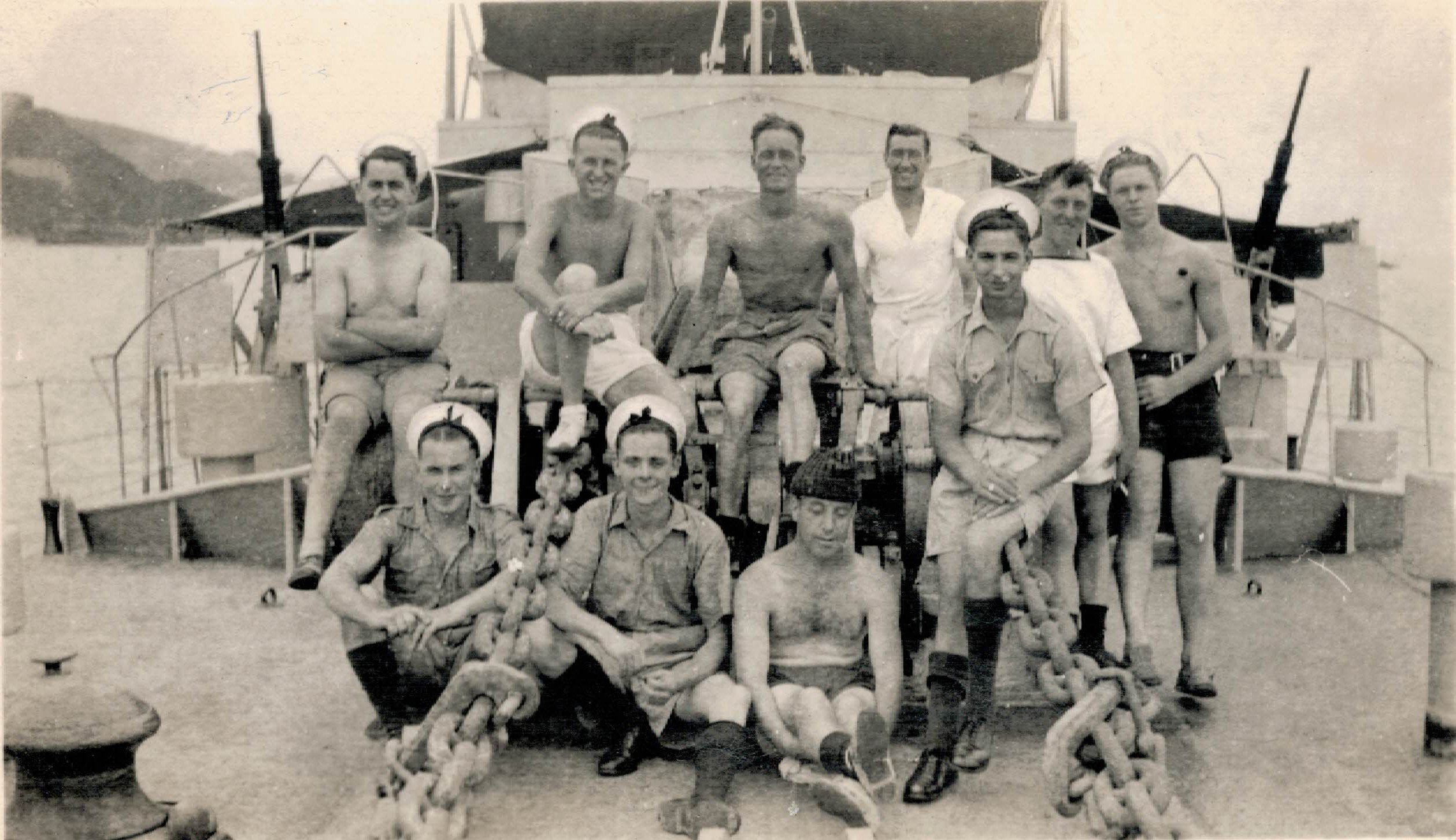 (NCL012) Norman Lock (RN) (right) and Douglas Miller, RCN - 1943. Norman stayed with Douglas Miller while on leave in 1943 at Oromocto, New Brunswick (NCL013) Norman Lock sitting in a car, presumably that of Douglas Miller's while staying at his place in Oromocto, New Brunswick while on leave (NCL014) Sailors on the quarterdeck of HMCS CHILLIWACK K131 - Jan 1943 (NCL015) Sailors on HMCS CHILLIWACK K131 - Jan 1943. The sailor on the lower left with the "x" on his sweater was awarded the B.E.M.