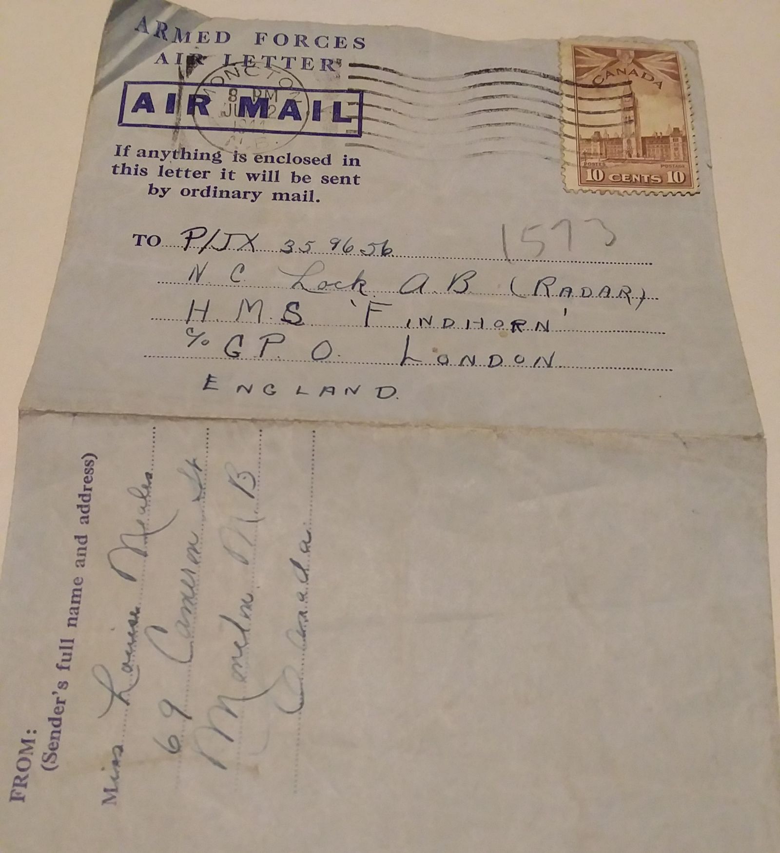 (NCL009) Mrs. Douglas Miller to Norman's father in England in 1953 enquiring about how he was getting on. (NCL010) Envelope cover for mail to Norman Lock on HMS FINDHORN from Louise Neals, Moncton, NB (NCL011) Addresses saved by Norman: Mrs. Urban Miller (mother of Doug Miller, RCN); Miss Louise Neals; and Mrs. Jean Barrat