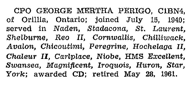 PERIGO, George Mertha, Acting Petty Officer Anti-Aircraft Rating 2nd Class, 3788, Mention in Despatches, RCN.  Awarded as per Canada Gazette of 5 January 1946 and London Gazette of 1 January 1946.