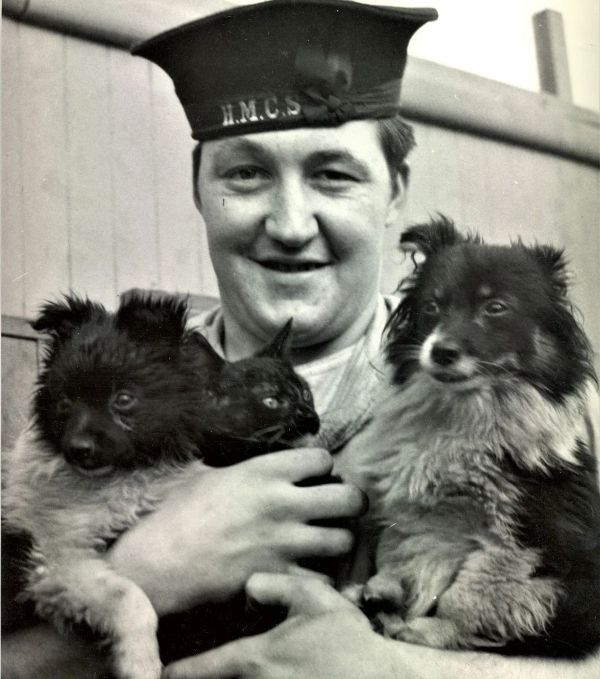 AB George Perigo with ship's mascots on HMCS CHILLIWACK K131