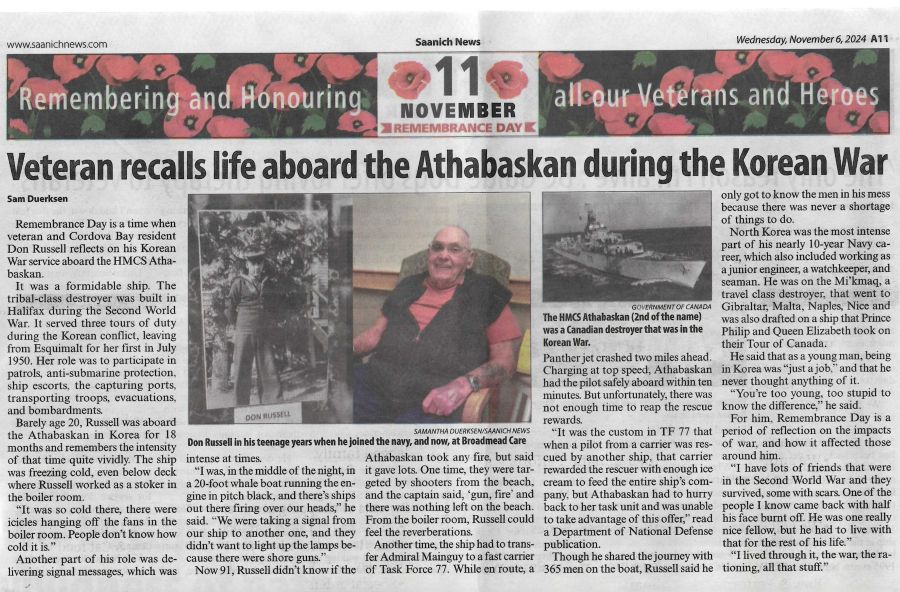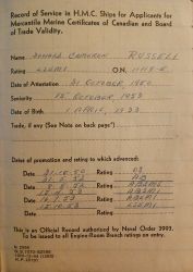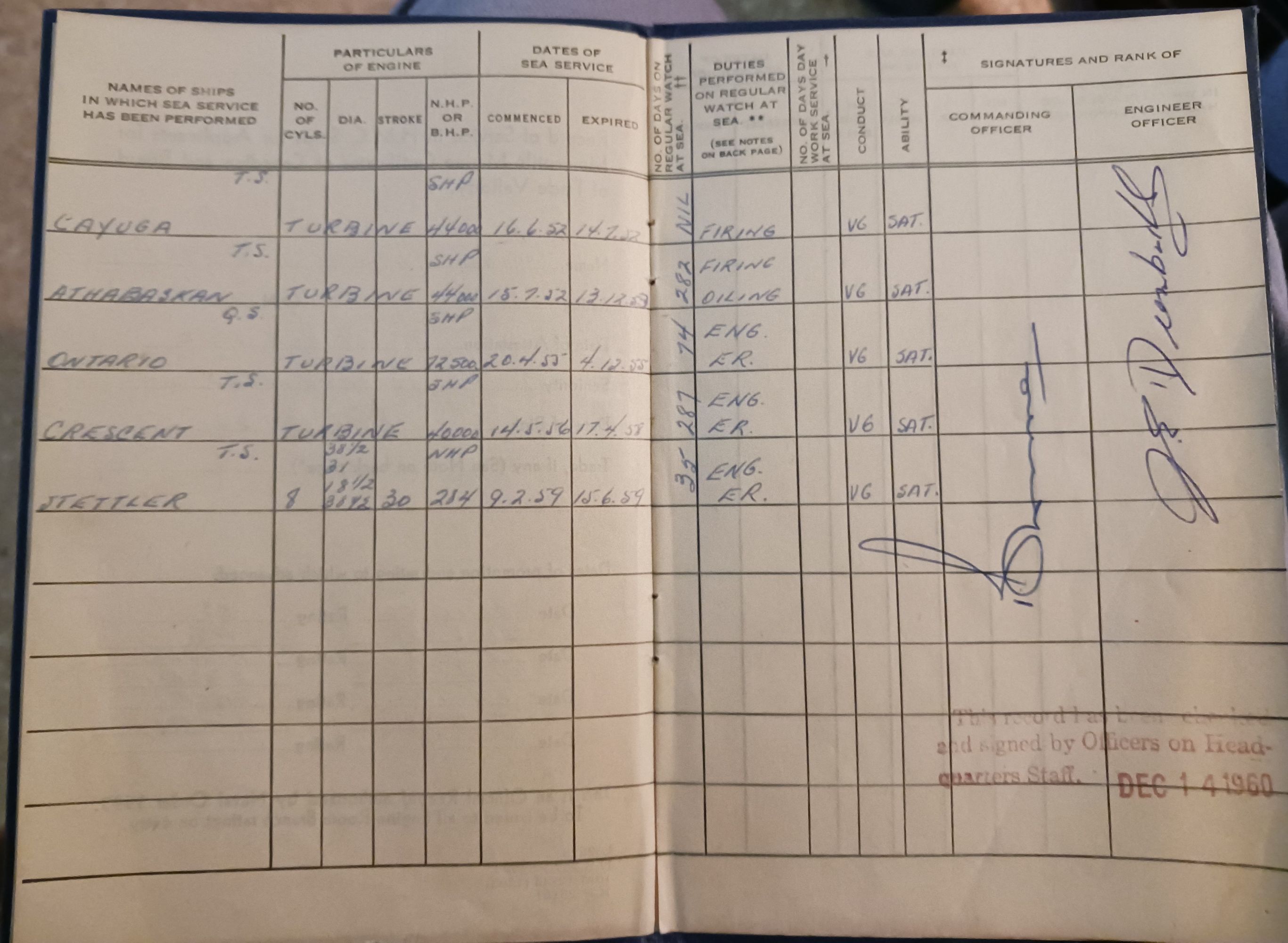 Ships served in: * Enlisted 31 Oct 1950 in the Seaman Branch, RCN and later transferred to the Engineering Branch HMCS CORNWALLIS, Annapolis Division - Oct 1950 HMCS MICMAC - Served in MICMAC in 1950 for Seamanship Training * Rated Able Seaman Stoker Mechanic Standard 08 May 1952 HMCS CAYUGA - Served in CAYUGA 16 Jun 1952 - 14 Jul 1952 as an Able Seaman Stoker Mechanic HMCS ATHABASKAN - Served in ATHABASKAN 15 Jul 1952 - 13 Dec 1953. Served in ATHABASKAN for her 3rd Korean War Tour * Rated Able Seaman Stoker Mechanic TG1 15 Apr 1943 * Rated Able Seaman Engineering Mechanic TG1 16 Jul 1953 * Rated Leading Seaman Engineering Mechanic TG1 15 Oct 1953 HMCS ONTARIO - Served in ONTARIO 20 Apr 1955 - 04 Dec 1955 HMCS CRESCENT - Served in CRESCENT 14 May 1956 - 17 Apr 1958 HMCS STETTLER - Served in STETTLER 09 Feb 1959 - 16 Jun 1959