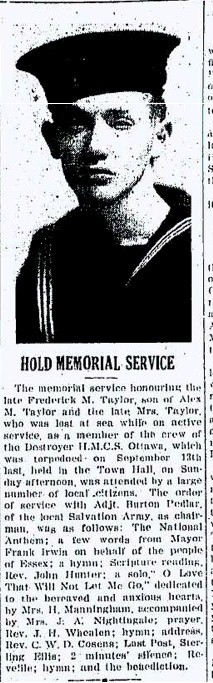 TAYLOR, Frederick Francis Monroe, AB A/AA III, V19524, RCNVR, MPK - 13 Sep 1942, HMCS OTTAWA - Son of Mr. and Mrs. Alexander Taylor, of Essex, Ontario.