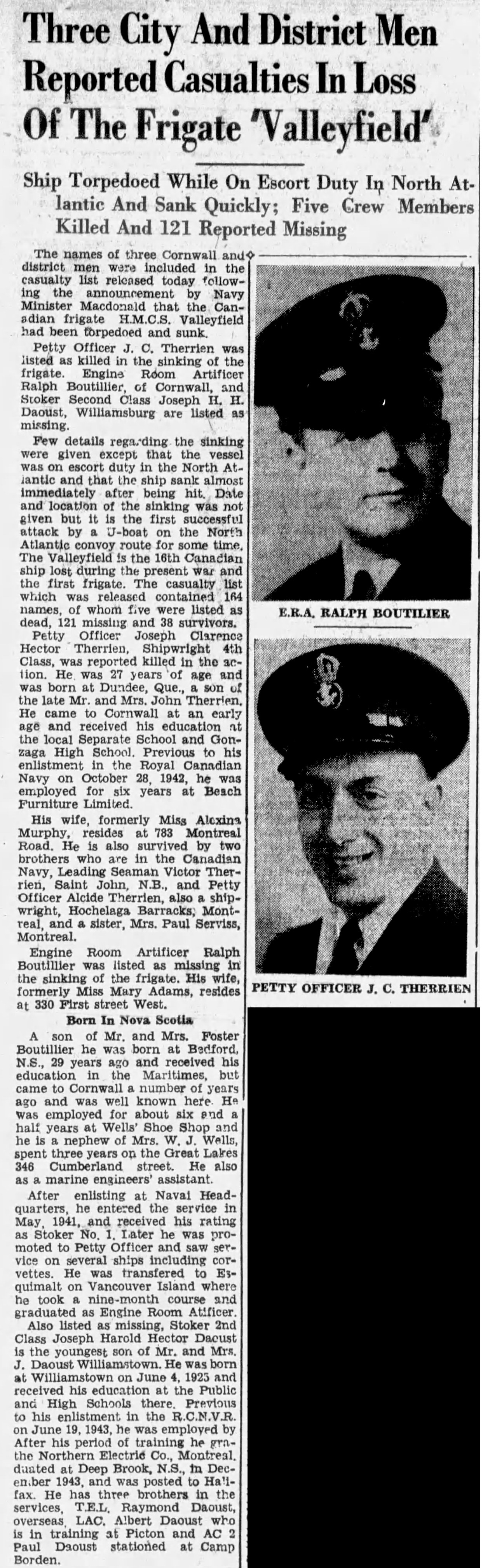 (RHB001) Article on the death of PO Joseph Therrian and Sto PO Ralph Boutilier // The Cornwall (Ontario) Daily Standard Freehold // Courtesy of Operation Picture Me (RHB002) Service file for Ralph Boutilier // The Library and Archives of Canada