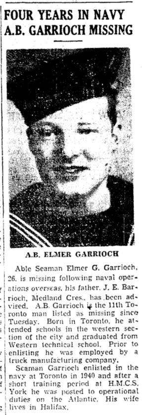 Able Seaman Elmer George Garrioch, age 26 is missing following naval operations overseas, his father J. E. Garrioch, Medland Crest, has been advised. Able Seaman Garrioch is the 11th Toronto man listed as missing. Born in Toronto he attended School in the western section of the city and graduated from Western Technical School. Prior to enlisting he was employed by a truck manufacturing company. Able Seaman Garrioch enlisted in the navy at Toronto in 1940 and after a short training period at H.M.C.S. York he was posted to operational duties on the Atlantic. His wife Edith Garrioch, lives in Halifax. (Source: Ultimate Sacrifice by Robert D'Aoust)