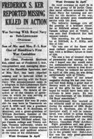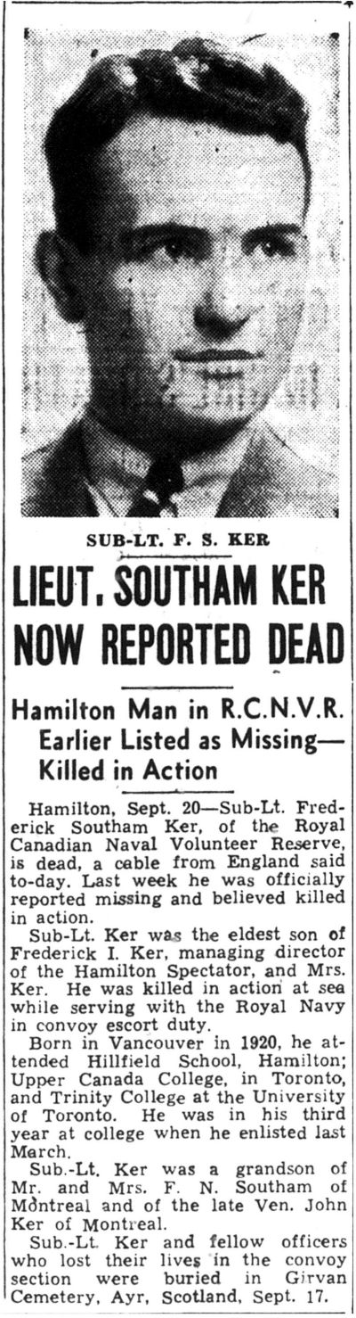 (FSK001) Portrait of SLt Frederick Ker (FSK002) Letters of Frederick Southam Ker, SLt, RCNVR - 1940. These letter, written home by SLt Frederick Ker, while on active service, have been compiled and edited by his mother, in the hope that for his family, and especially his brothers and sisters, they will help to preserve a proud and happy memory // From the collection of Ross Somerville, Leading Coder, RCNVR (FSK003) Article: Frederick S. Ker Reported Missing, Killed in Action // The Hamilton Spectator Sep 1940 (FSK004) Article: Lieutenant Southam Ker now reported Dead // The Toronto Telegram Sep 1940 (FSK005) Service File for Frederick S. Ker // Source: The Library and Archives of Canada