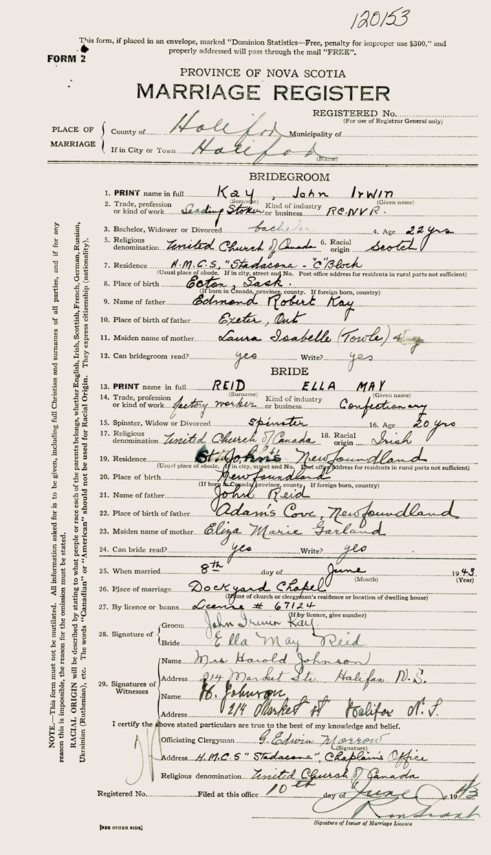 Below: Marriage Register for John Kay and Ella Reid Source: Nova Scotia Archives