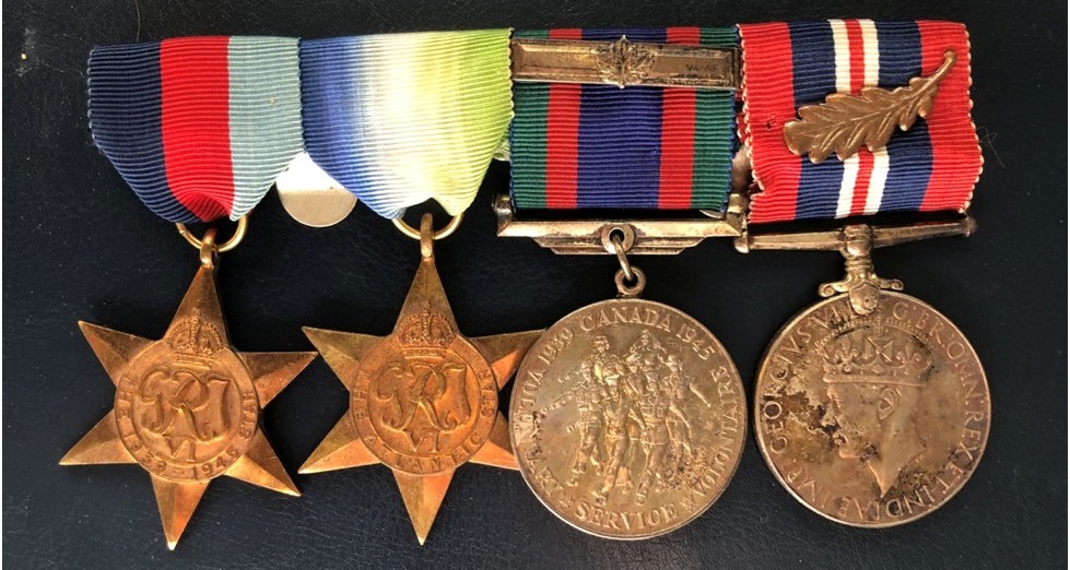 (HSM001) Medals for Commander Herries Maxwell, RCNVR / RCN(R) // 1939-45 Star; Atlantic Star; Canadian Volunteer Service Medal, War Medal 1939-45 with Oak Leaf for Mentioned in Despatches (HSM002) Service file for Herries Maxwell