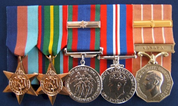 John Hyslop's Medals: 1939-45 Star; Pacific Star; Canadian Volunteer Service Medal, with clasp; War Medal 1939-45, Canadian issue in silver; Canadian Forces Decoration with Bar. To the right of his medals is his submariner qualification pin.