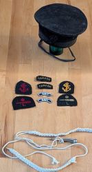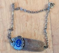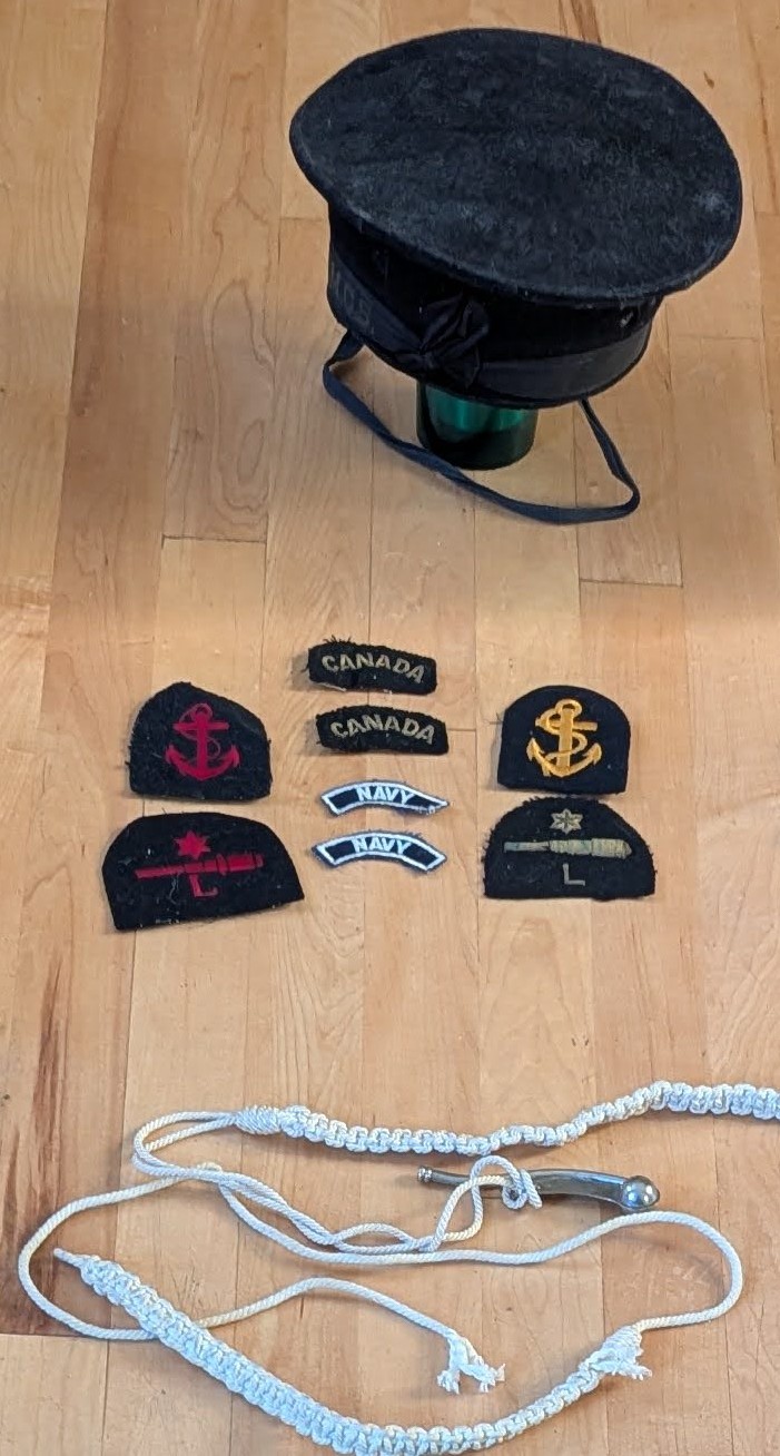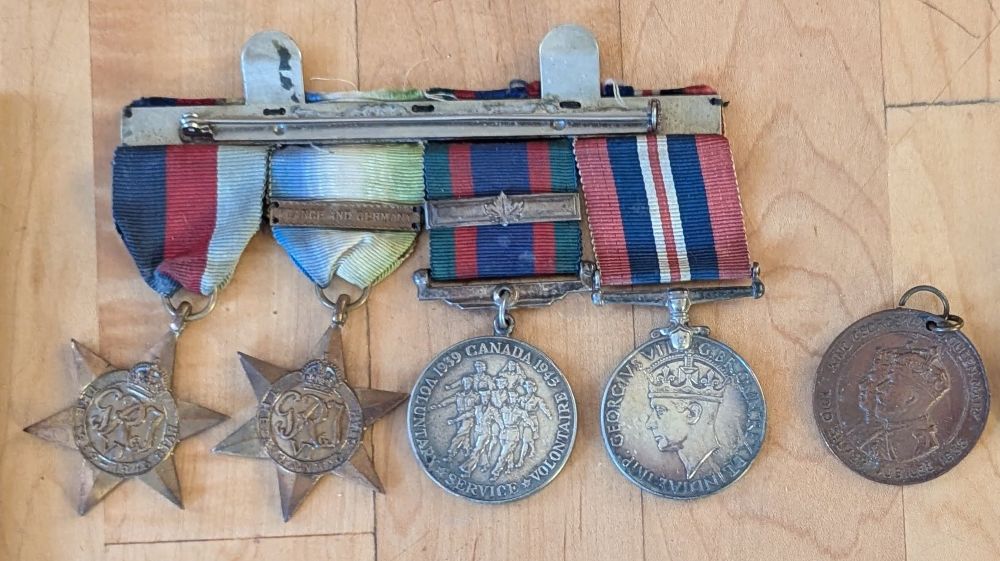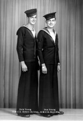 (FY01) Dick Young (left) and his brother Don Young (FY02) Dick's medals - 1939-45 Star; Atlantic Star with France and Germany Bar; Canadian Volunteer Service Medal with Clasp; War Medal 1939-45. Dick also had a King George V Silver Jubilee Medal but he was not serving at the time it was issued so it is not known how it came to be in his collection. (FY03) Dick's port and starboard cap, trade and rank badges (FY04) Dick's I.D. bracelet